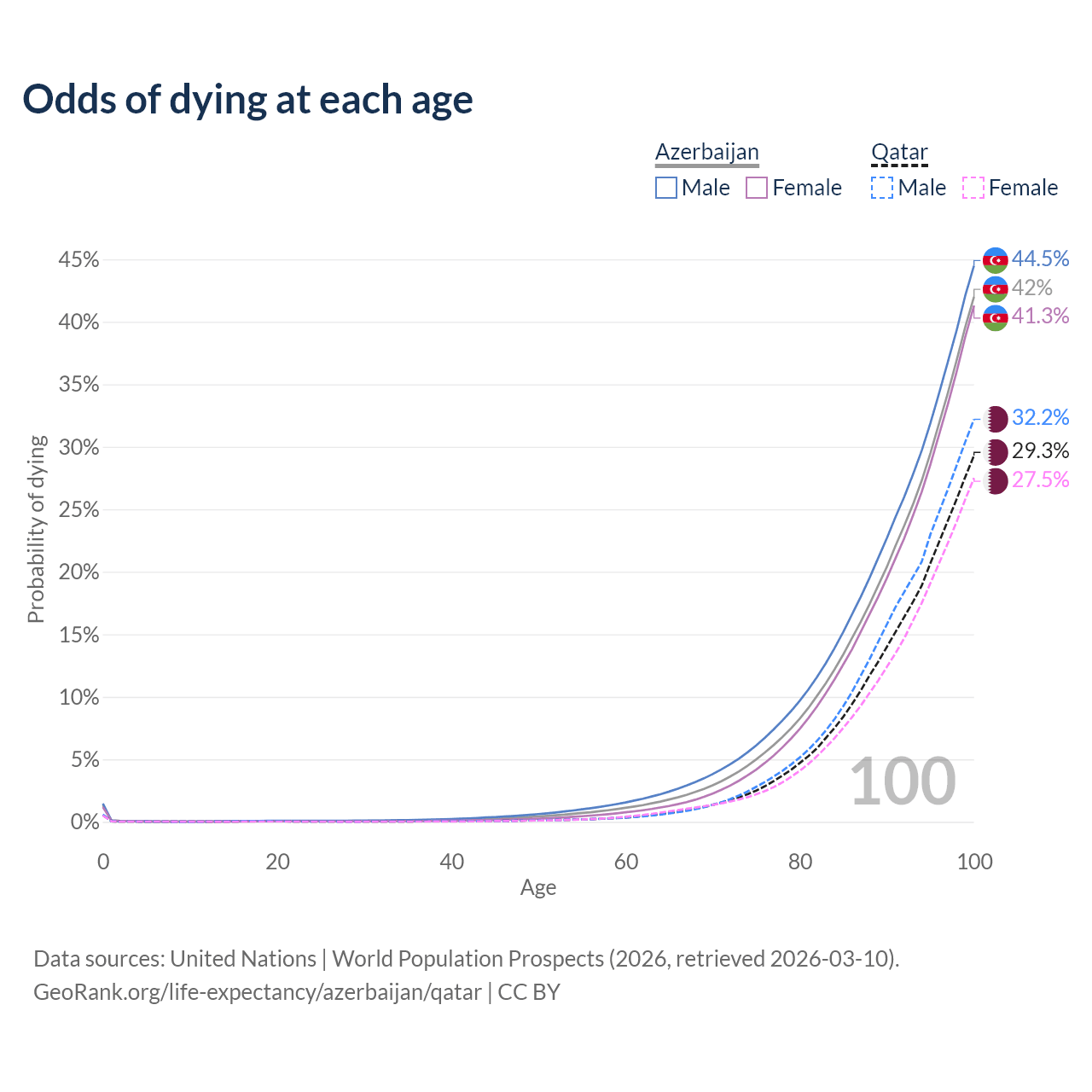 This life expectancy calculator shows the odds of living to 100, 95, 90, and below based on current age for both males and females in Azerbaijan and Qatar, along with mean and median age of death. The calculations are based on the 2026 life tables (actuarial tables) from the UN World Population Prospects.