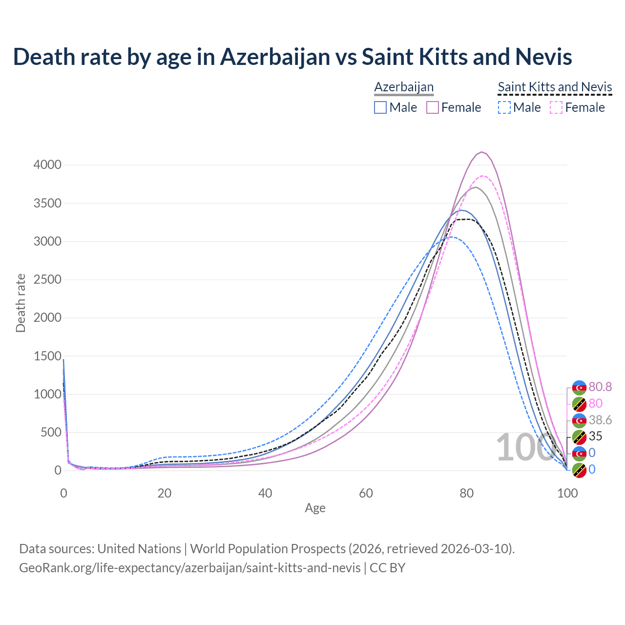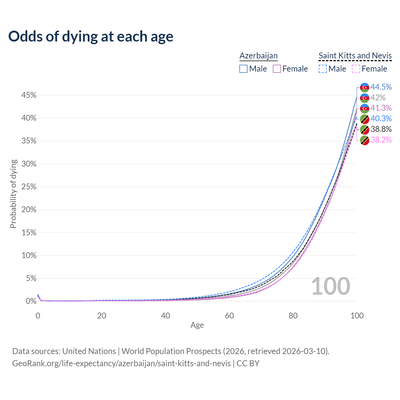 This life expectancy calculator shows the odds of living to 100, 95, 90, and below based on current age for both males and females in Azerbaijan and Saint Kitts and Nevis, along with mean and median age of death. The calculations are based on the 2026 life tables (actuarial tables) from the UN World Population Prospects.