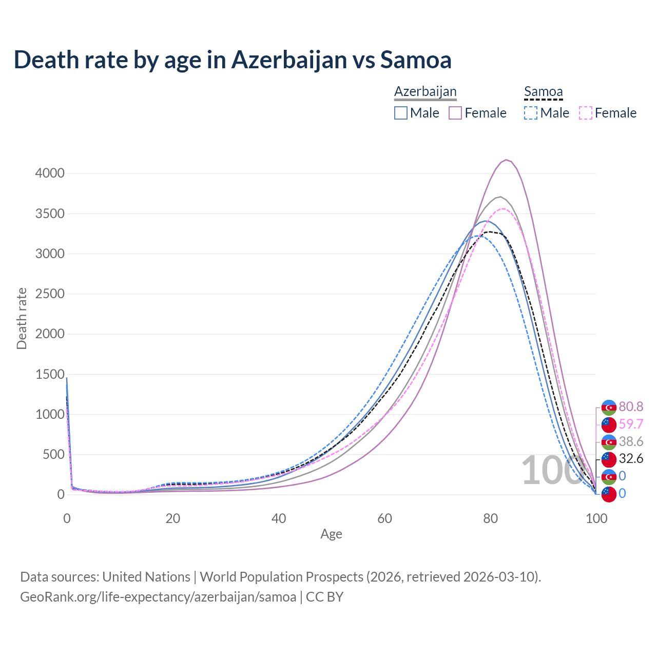 This life expectancy calculator shows the odds of living to 100, 95, 90, and below based on current age for both males and females in Azerbaijan and Samoa, along with mean and median age of death. The calculations are based on the 2026 life tables (actuarial tables) from the UN World Population Prospects.