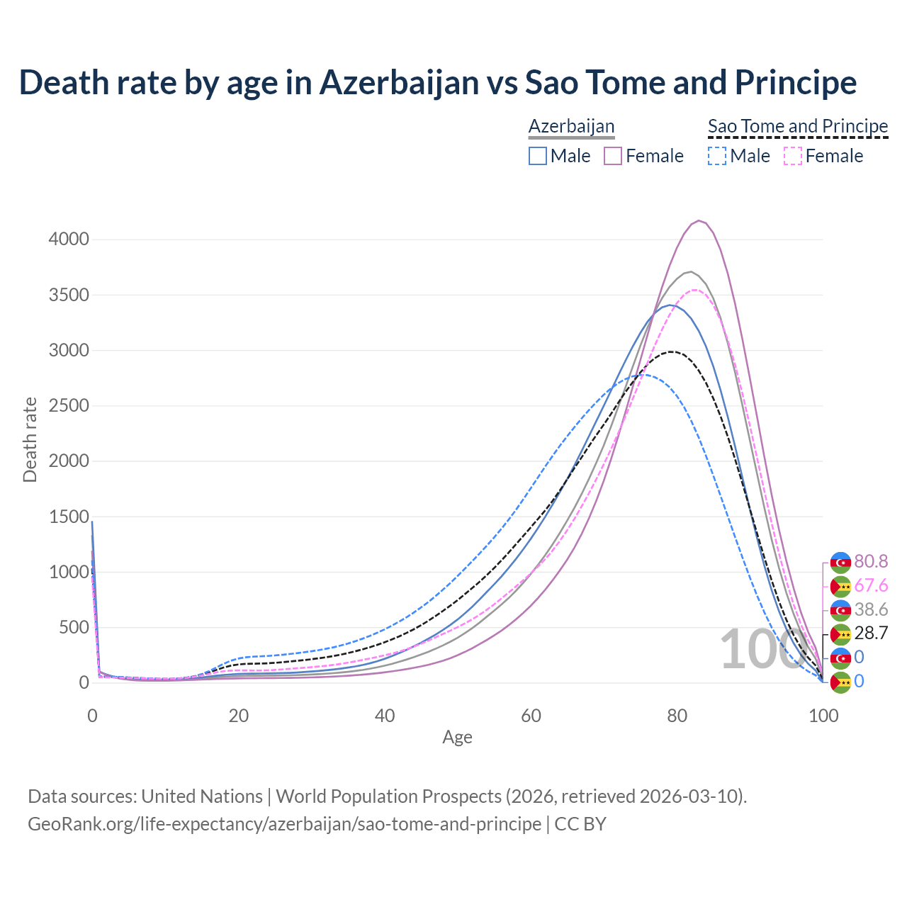 In Azerbaijan, the most common age of death is 82, compared to 79 in Sao Tome and Principe. The median age of death is 78.3 in Azerbaijan and 74.1 in Sao Tome and Principe, meaning only half of each cohort is expected to live past that age.