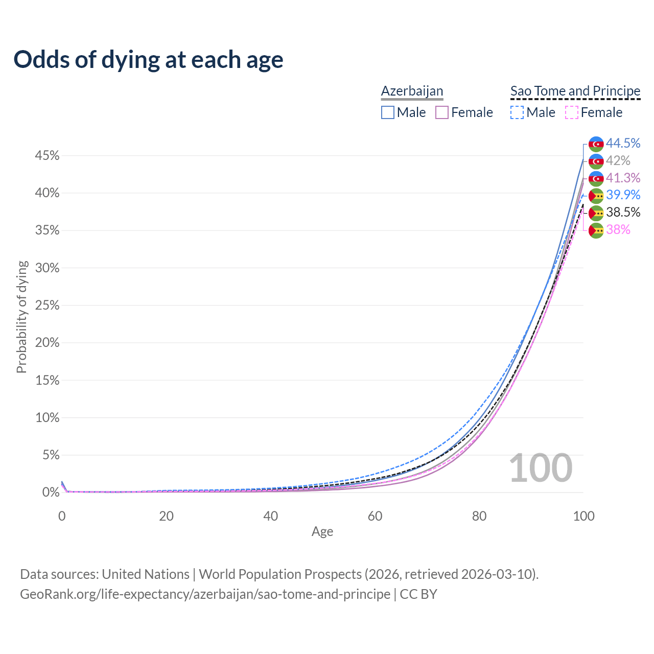 This life expectancy calculator shows the odds of living to 100, 95, 90, and below based on current age for both males and females in Azerbaijan and Sao Tome and Principe, along with mean and median age of death. The calculations are based on the 2026 life tables (actuarial tables) from the UN World Population Prospects.