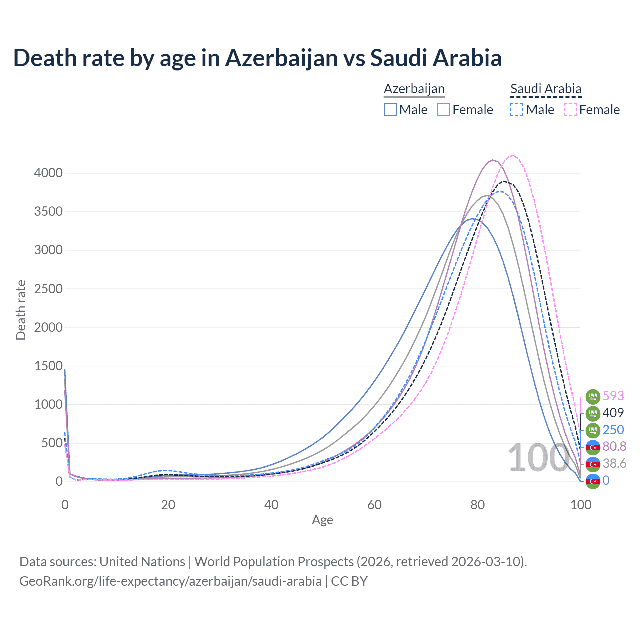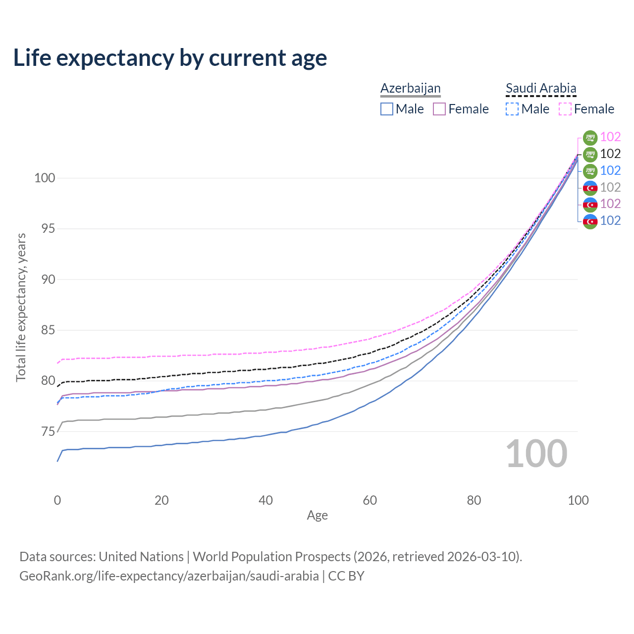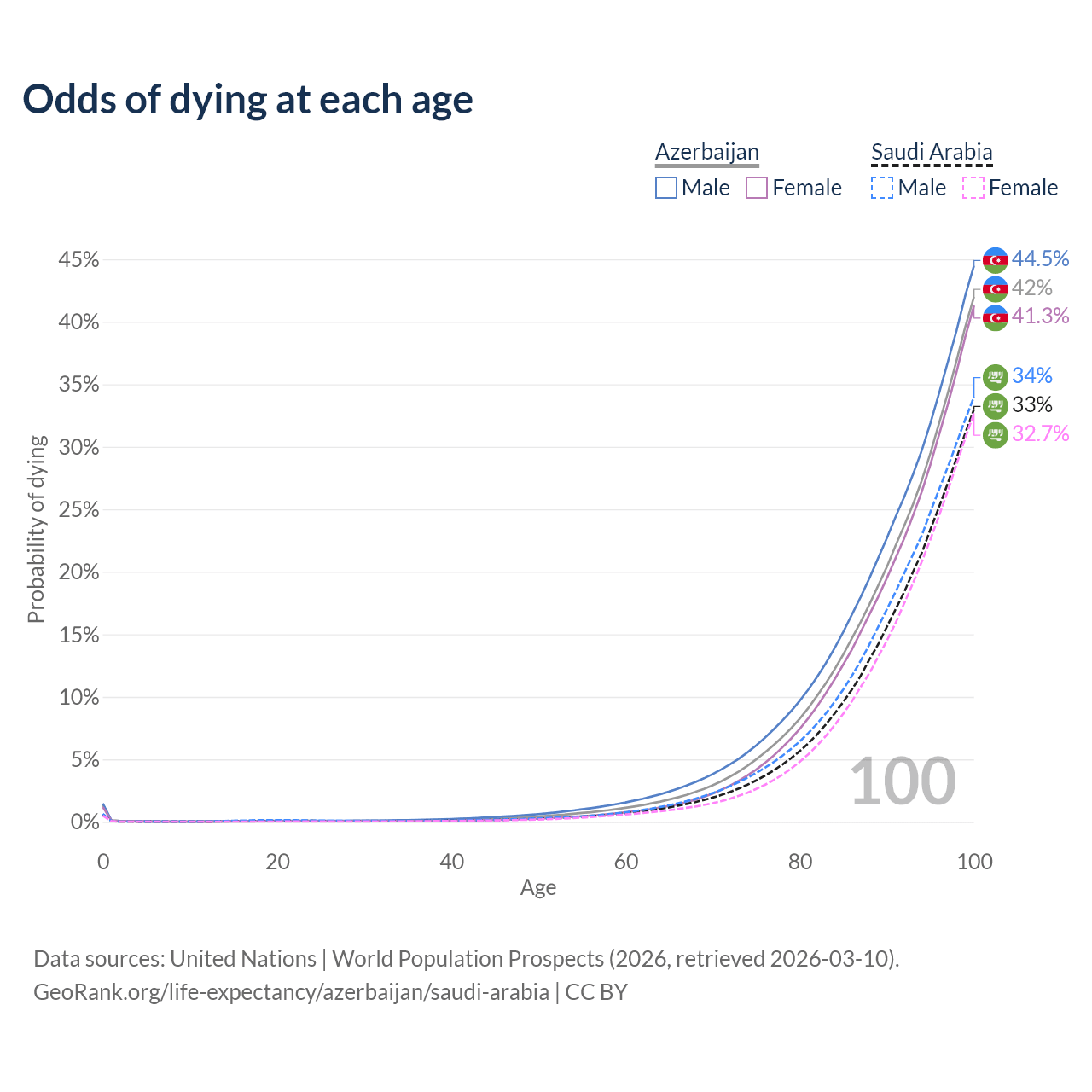 This life expectancy calculator shows the odds of living to 100, 95, 90, and below based on current age for both males and females in Azerbaijan and Saudi Arabia, along with mean and median age of death. The calculations are based on the 2026 life tables (actuarial tables) from the UN World Population Prospects.