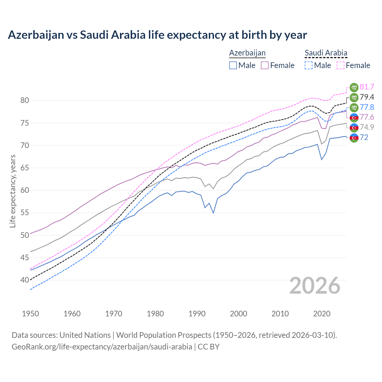 The average life expectancy at birth is 74.9 years in Azerbaijan vs 79.4 in Saudi Arabia. Azerbaijan is ranked 98/197 by life expectancy, and Saudi Arabia is 49/197. In Azerbaijan, the life expectancy is 72 years for males and 77.6 years for females. In Saudi Arabia, it's 77.8 years for males and 81.7 years for females.