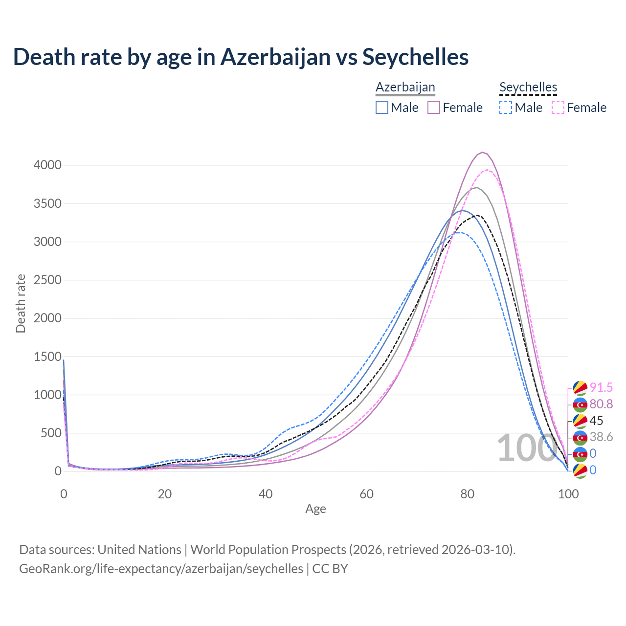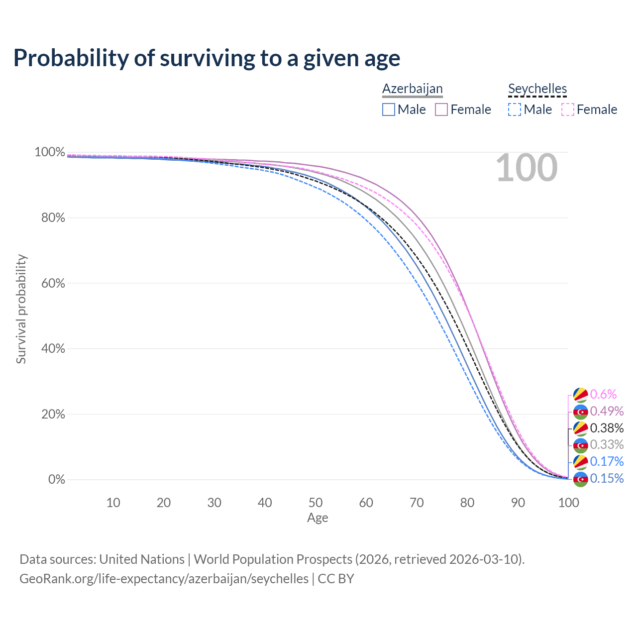 This life expectancy calculator shows the odds of living to 100, 95, 90, and below based on current age for both males and females in Azerbaijan and the Seychelles, along with mean and median age of death. The calculations are based on the 2026 life tables (actuarial tables) from the UN World Population Prospects.