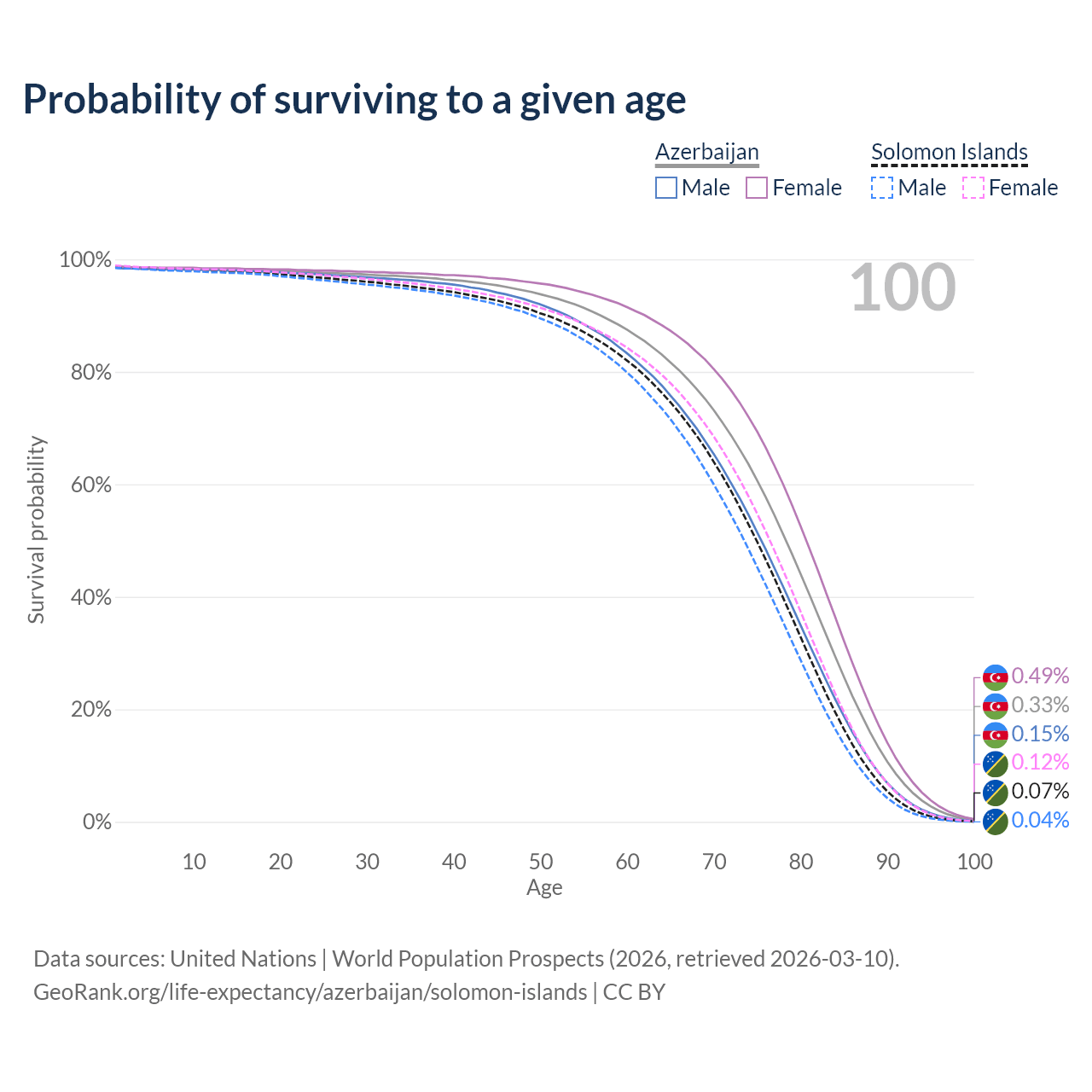 This life expectancy calculator shows the odds of living to 100, 95, 90, and below based on current age for both males and females in Azerbaijan and the Solomon Islands, along with mean and median age of death. The calculations are based on the 2026 life tables (actuarial tables) from the UN World Population Prospects.
