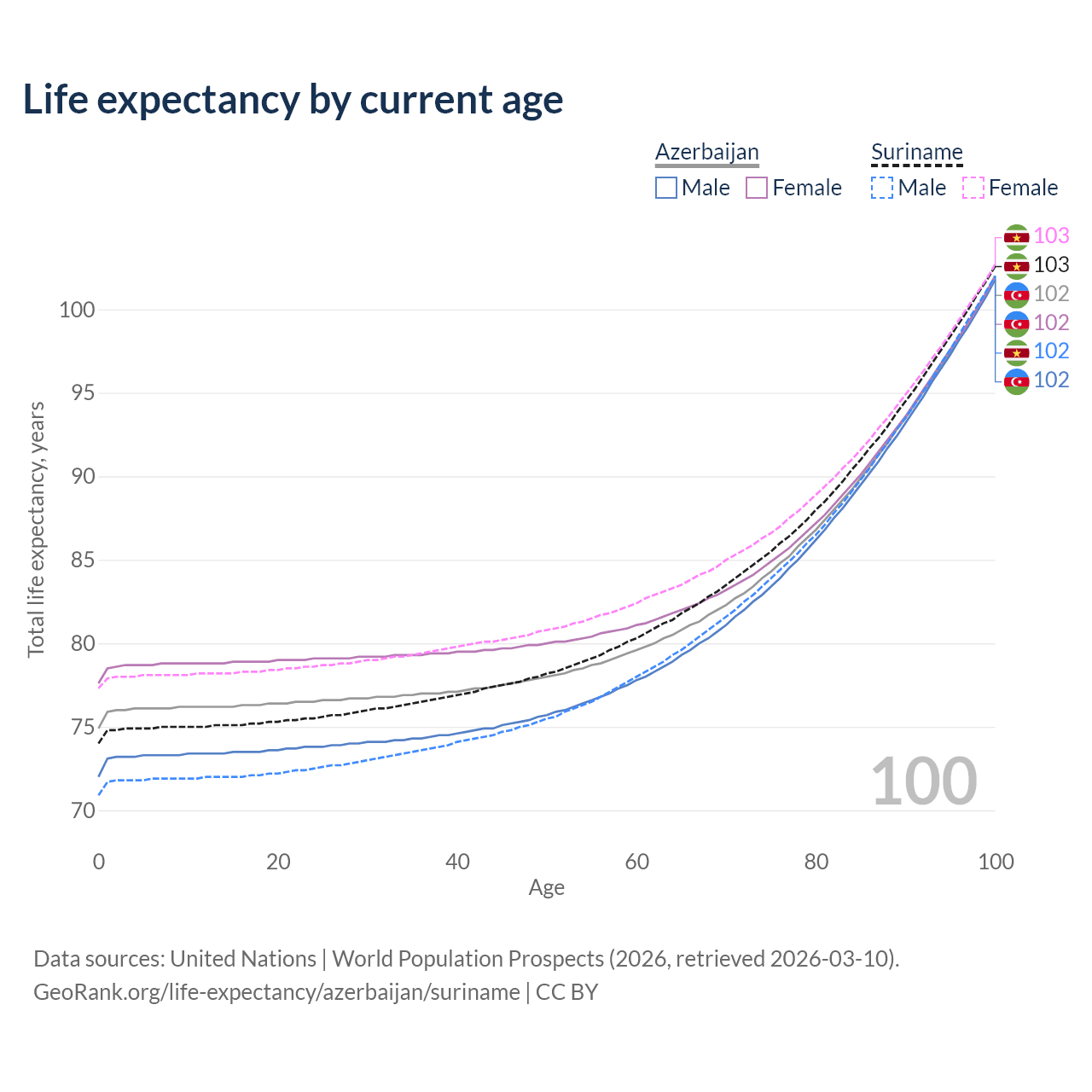 This life expectancy calculator shows the odds of living to 100, 95, 90, and below based on current age for both males and females in Azerbaijan and Suriname, along with mean and median age of death. The calculations are based on the 2026 life tables (actuarial tables) from the UN World Population Prospects.