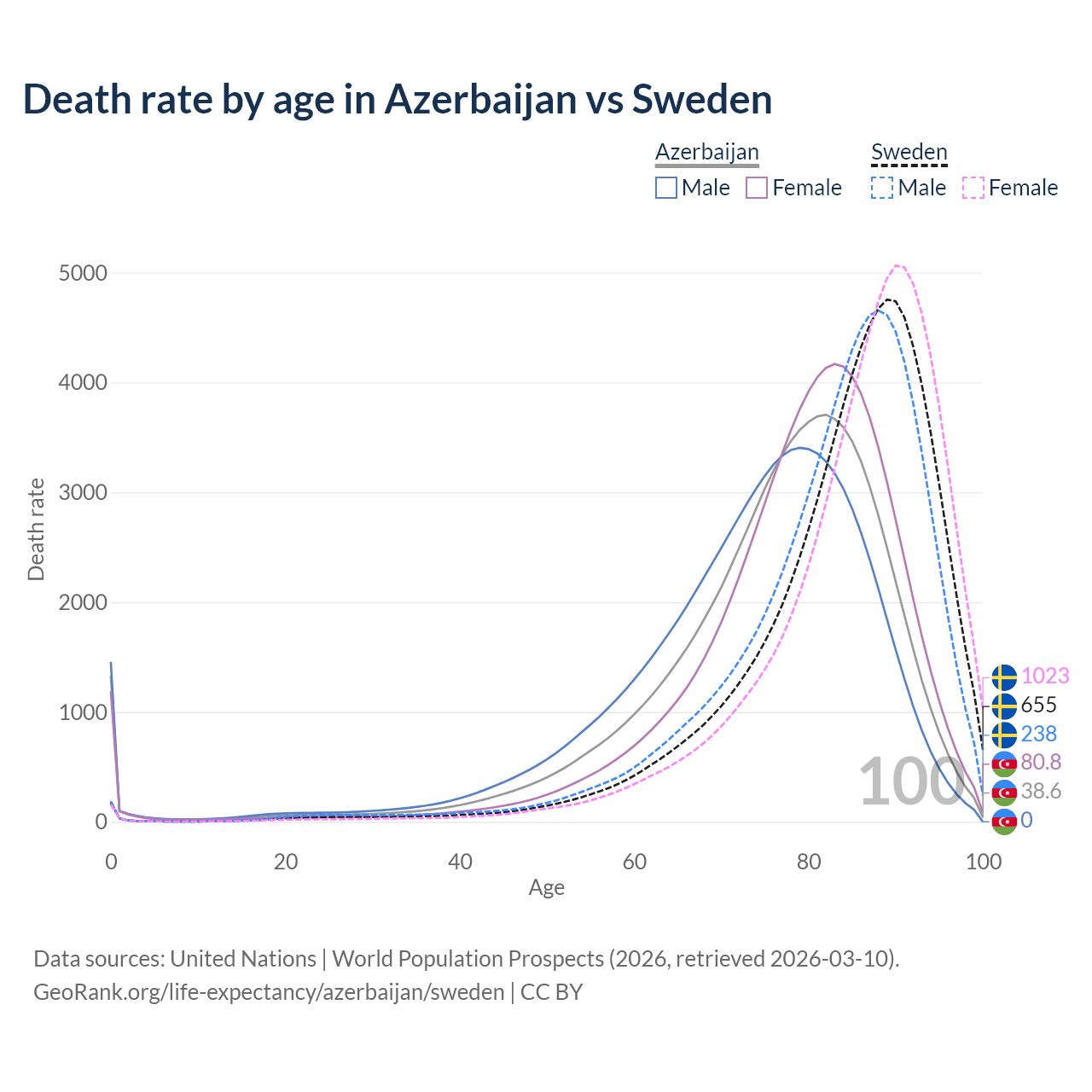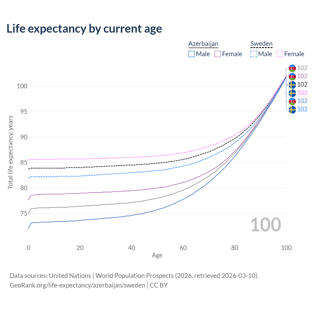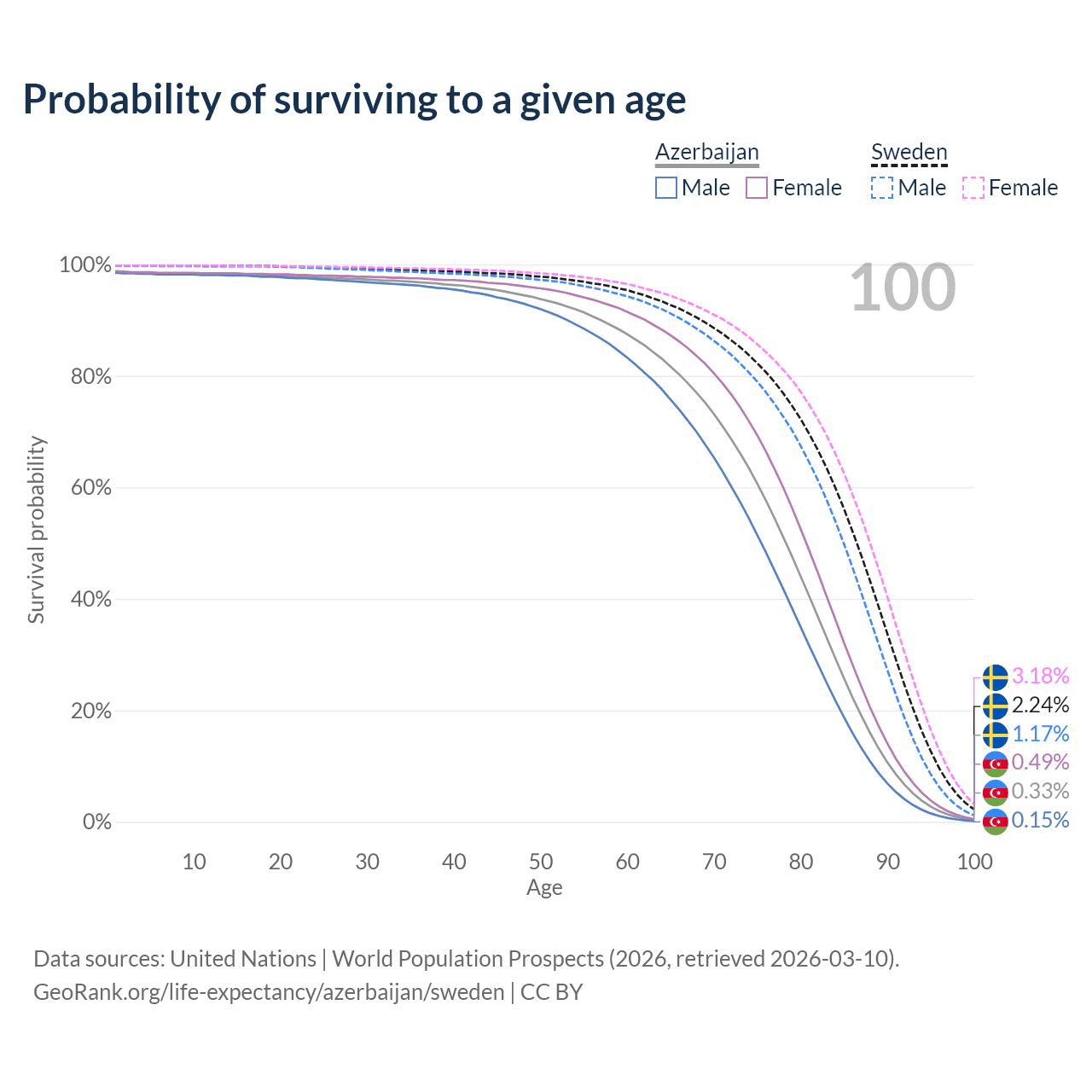 This life expectancy calculator shows the odds of living to 100, 95, 90, and below based on current age for both males and females in Azerbaijan and Sweden, along with mean and median age of death. The calculations are based on the 2026 life tables (actuarial tables) from the UN World Population Prospects.