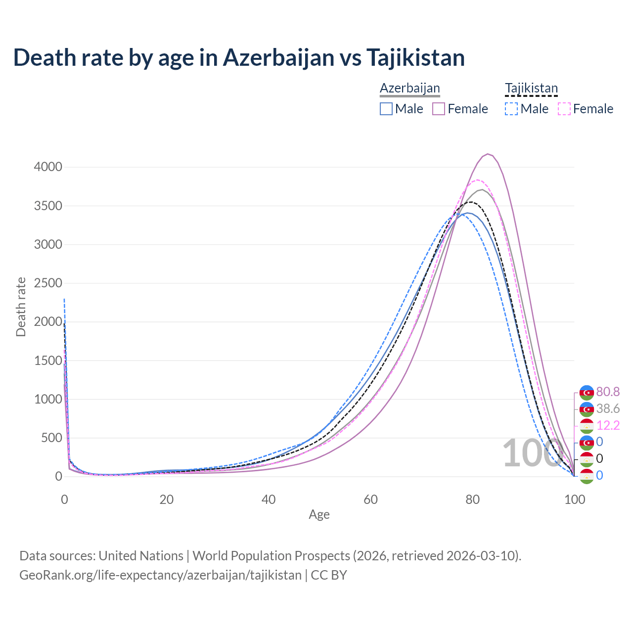 This life expectancy calculator shows the odds of living to 100, 95, 90, and below based on current age for both males and females in Azerbaijan and Tajikistan, along with mean and median age of death. The calculations are based on the 2026 life tables (actuarial tables) from the UN World Population Prospects.