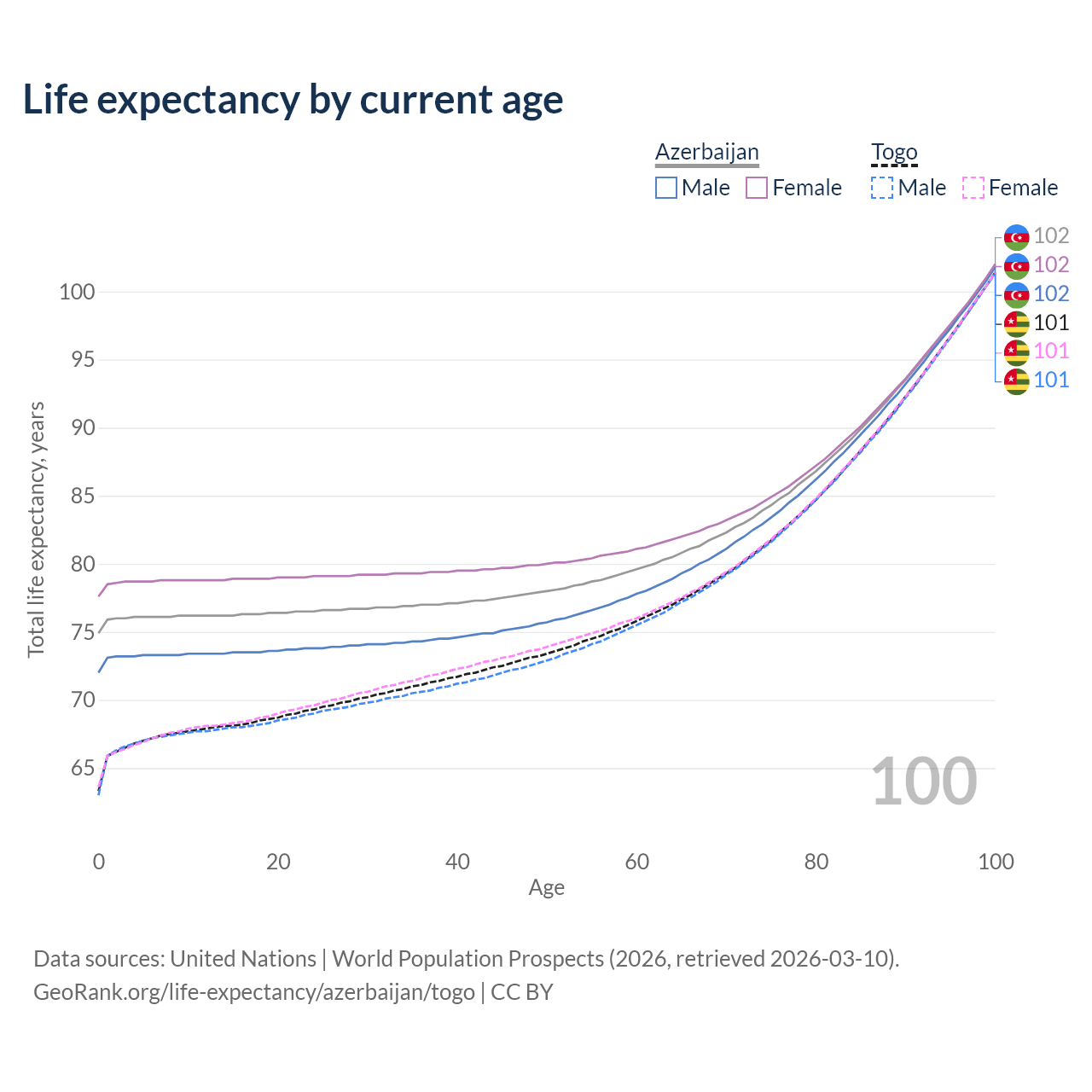 This life expectancy calculator shows the odds of living to 100, 95, 90, and below based on current age for both males and females in Azerbaijan and Togo, along with mean and median age of death. The calculations are based on the 2026 life tables (actuarial tables) from the UN World Population Prospects.