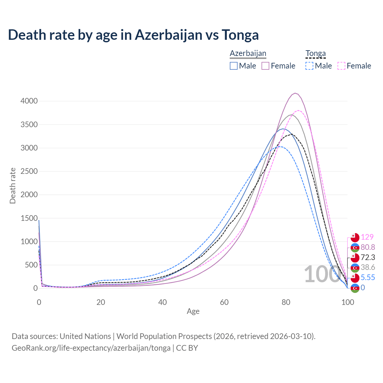 In Azerbaijan, the most common age of death is 82, compared to 82 in Tonga. The median age of death is 78.3 in Azerbaijan and 77 in Tonga, meaning only half of each cohort is expected to live past that age.