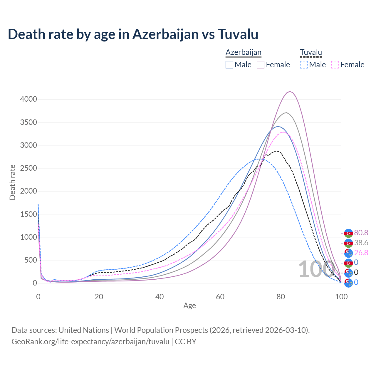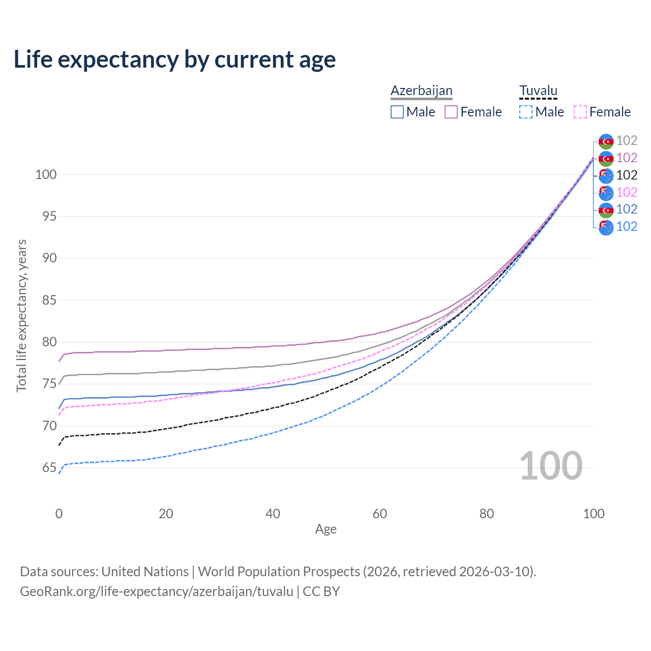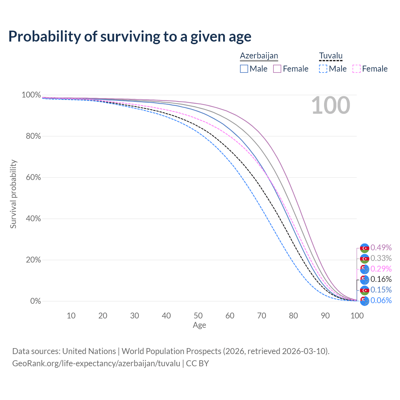 This life expectancy calculator shows the odds of living to 100, 95, 90, and below based on current age for both males and females in Azerbaijan and Tuvalu, along with mean and median age of death. The calculations are based on the 2026 life tables (actuarial tables) from the UN World Population Prospects.