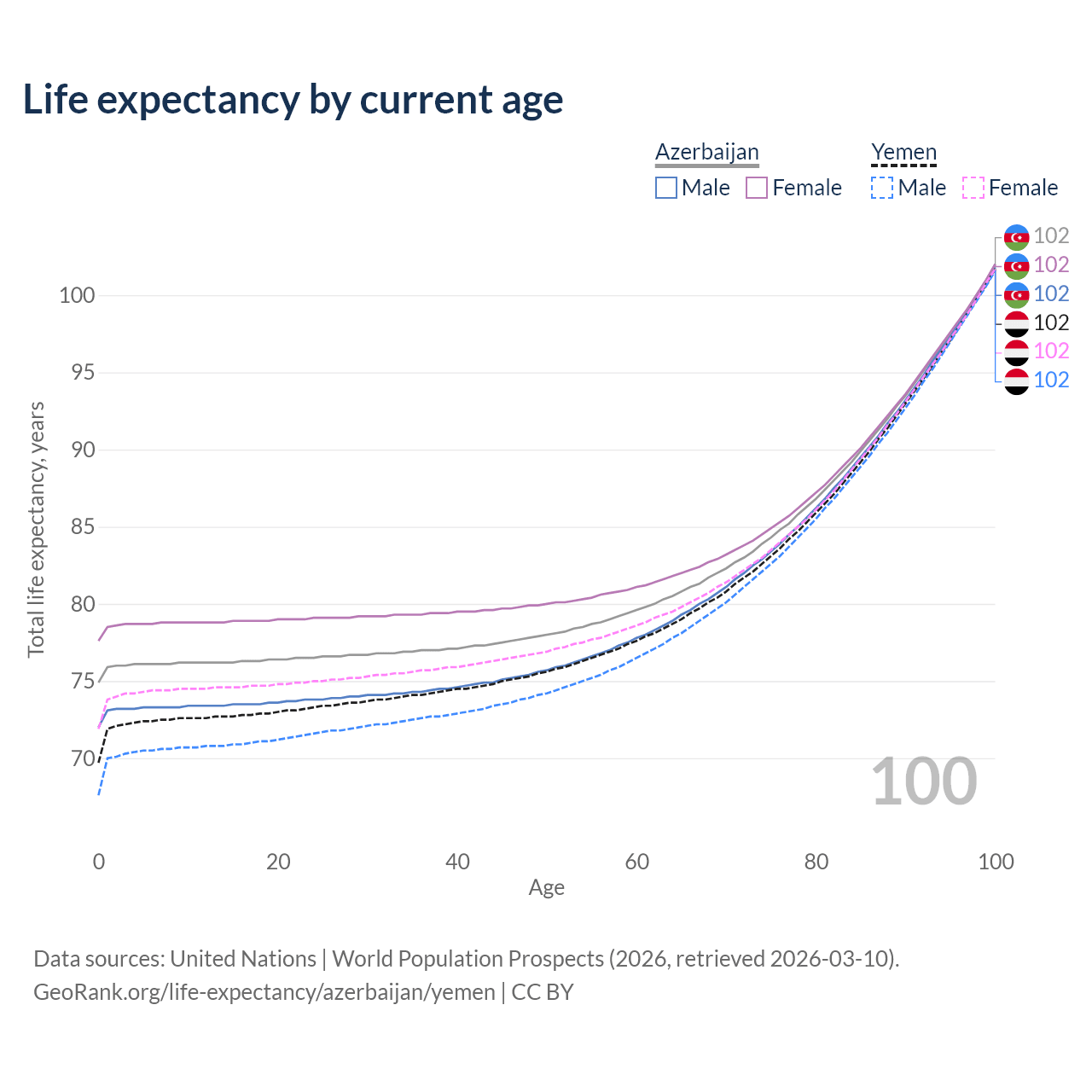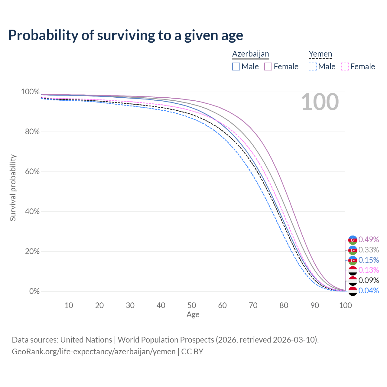 This life expectancy calculator shows the odds of living to 100, 95, 90, and below based on current age for both males and females in Azerbaijan and Yemen, along with mean and median age of death. The calculations are based on the 2026 life tables (actuarial tables) from the UN World Population Prospects.