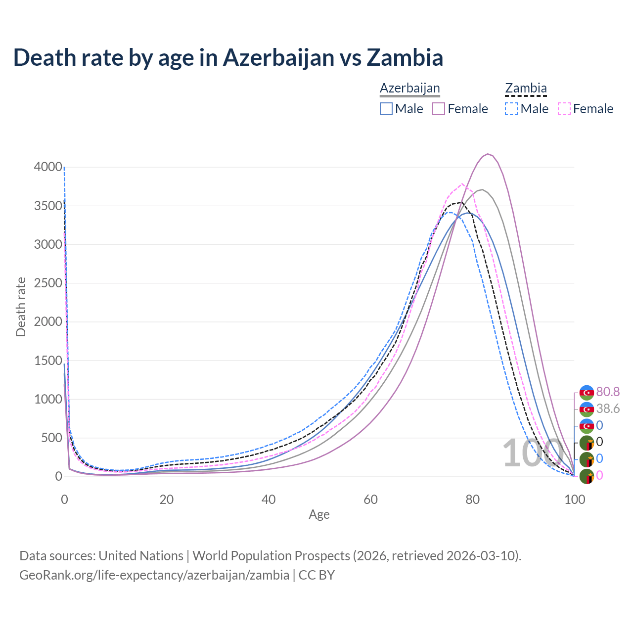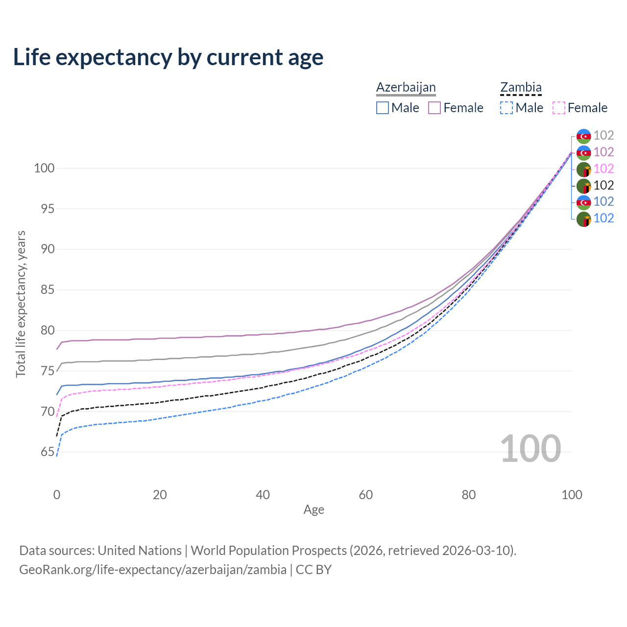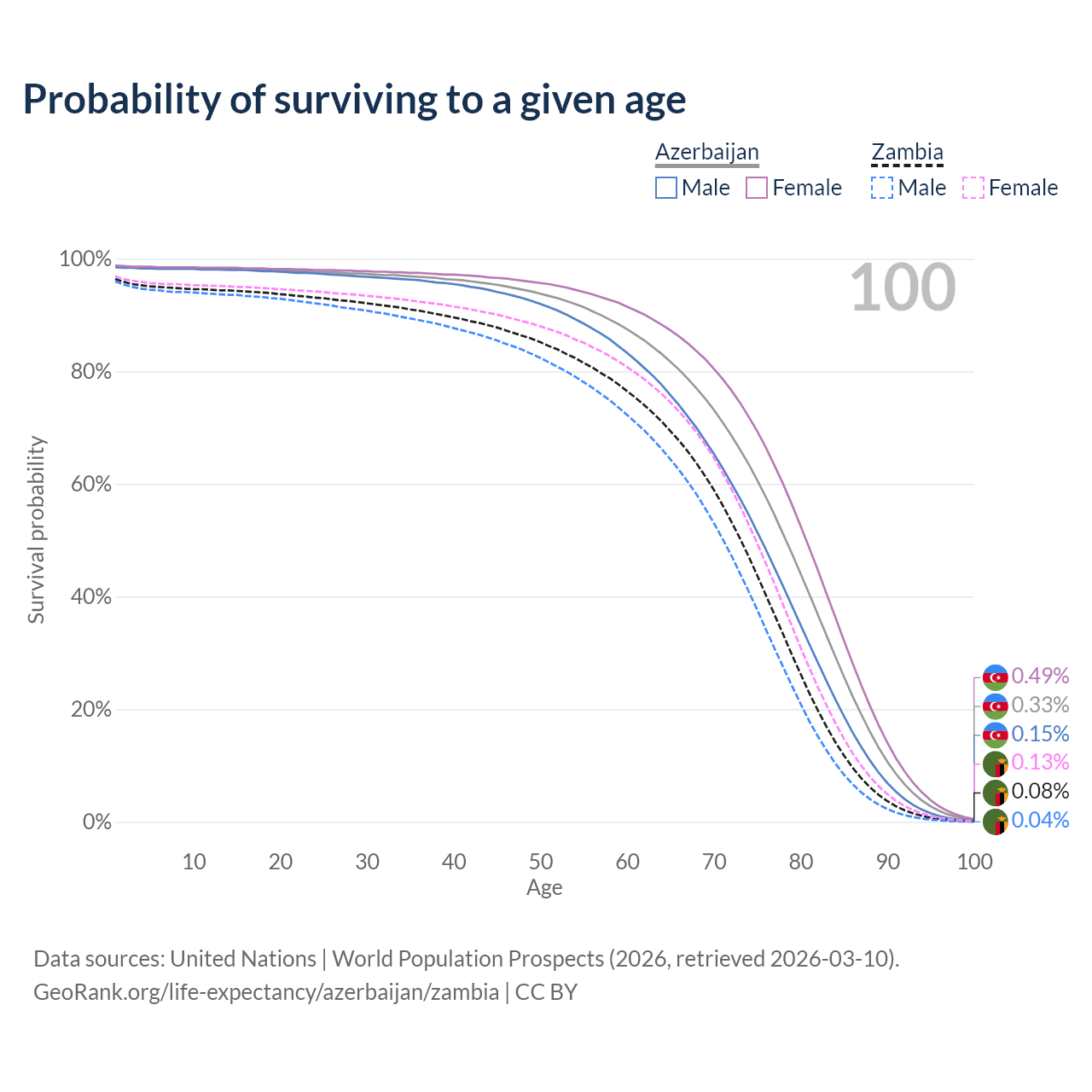 This life expectancy calculator shows the odds of living to 100, 95, 90, and below based on current age for both males and females in Azerbaijan and Zambia, along with mean and median age of death. The calculations are based on the 2026 life tables (actuarial tables) from the UN World Population Prospects.