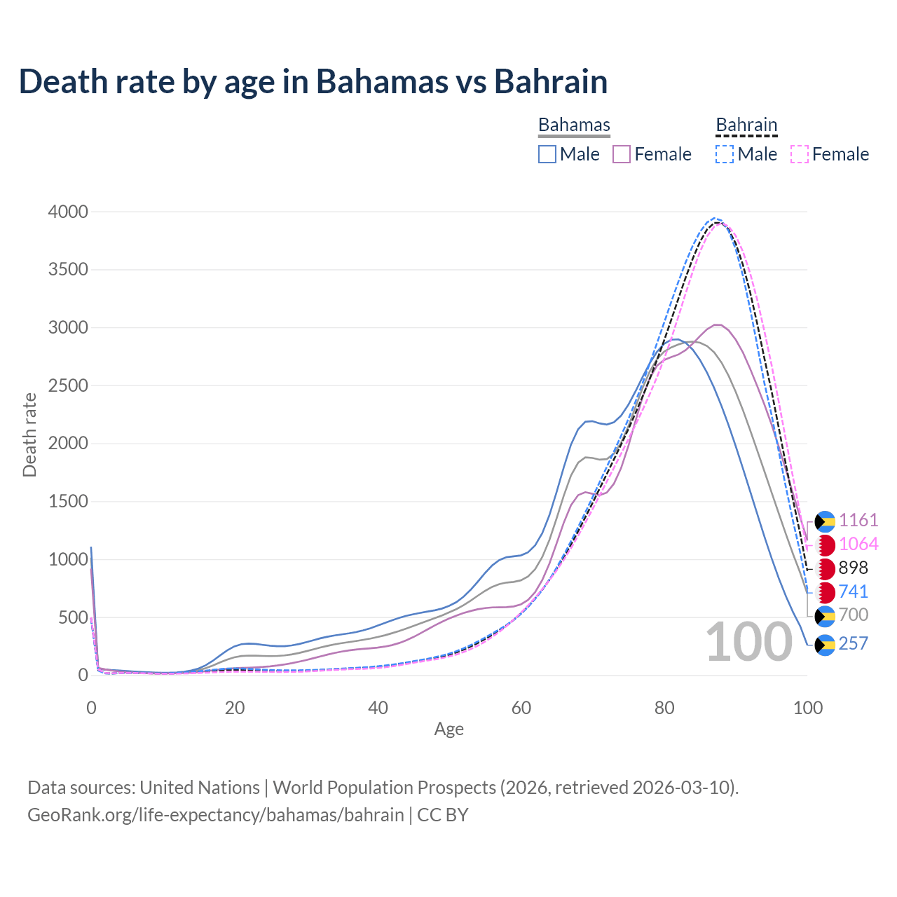 This life expectancy calculator shows the odds of living to 100, 95, 90, and below based on current age for both males and females in the Bahamas and Bahrain, along with mean and median age of death. The calculations are based on the 2026 life tables (actuarial tables) from the UN World Population Prospects.