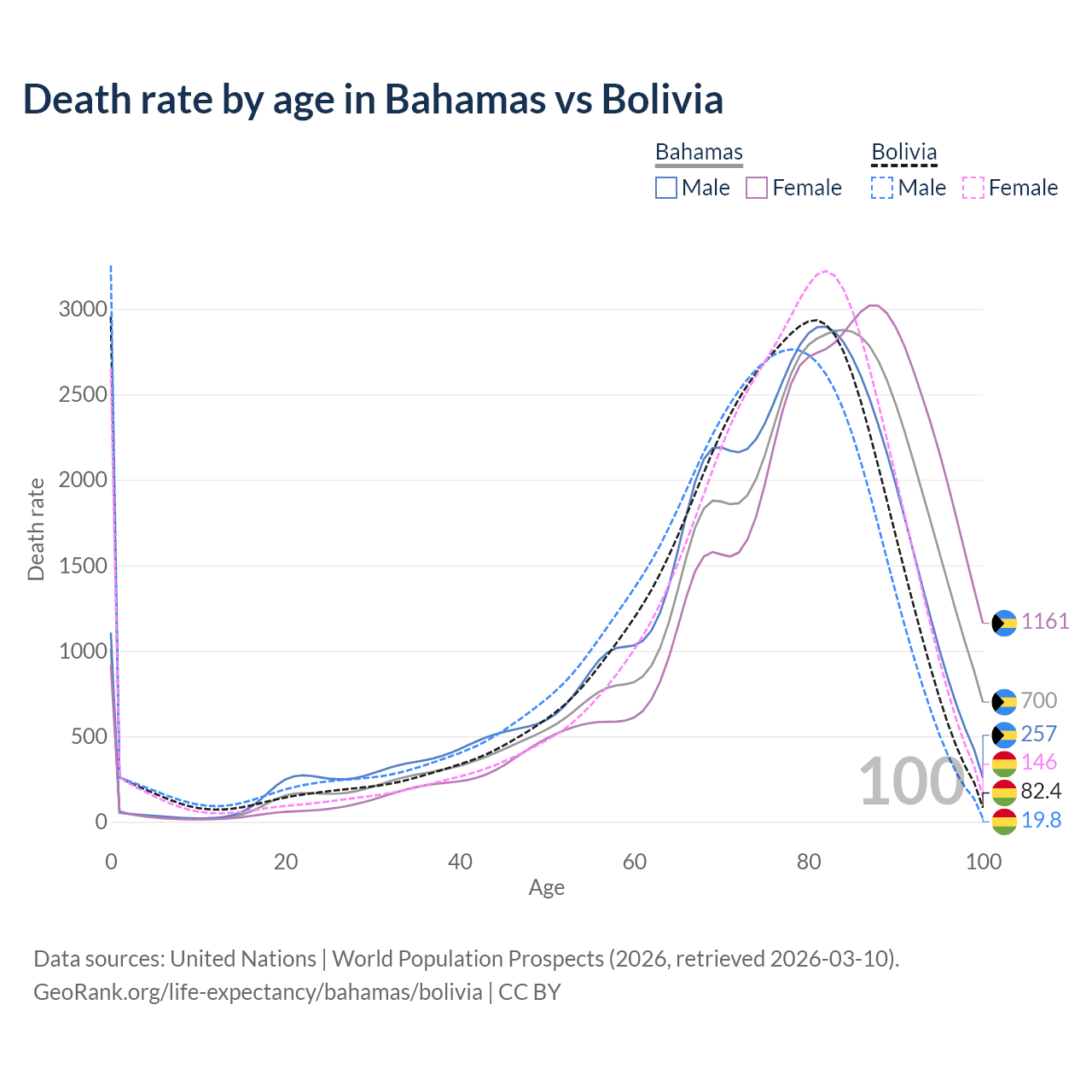 In the Bahamas, the most common age of death is 84, compared to 0 in Bolivia. The median age of death is 79.2 in the Bahamas and 74.5 in Bolivia, meaning only half of each cohort is expected to live past that age.