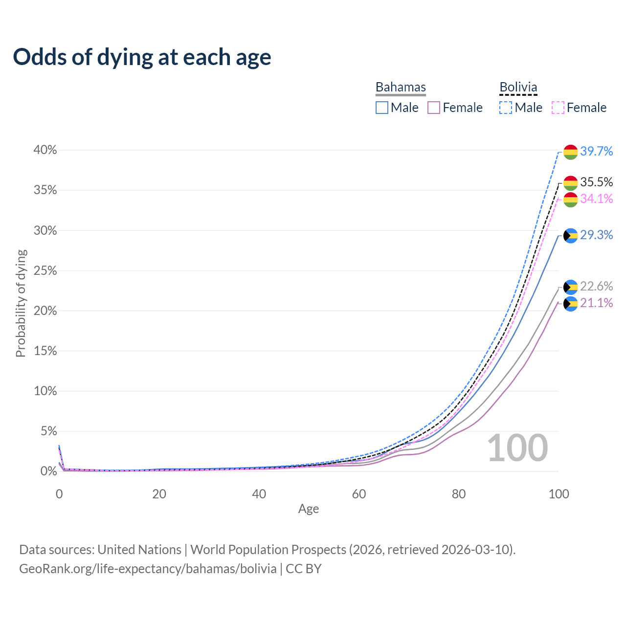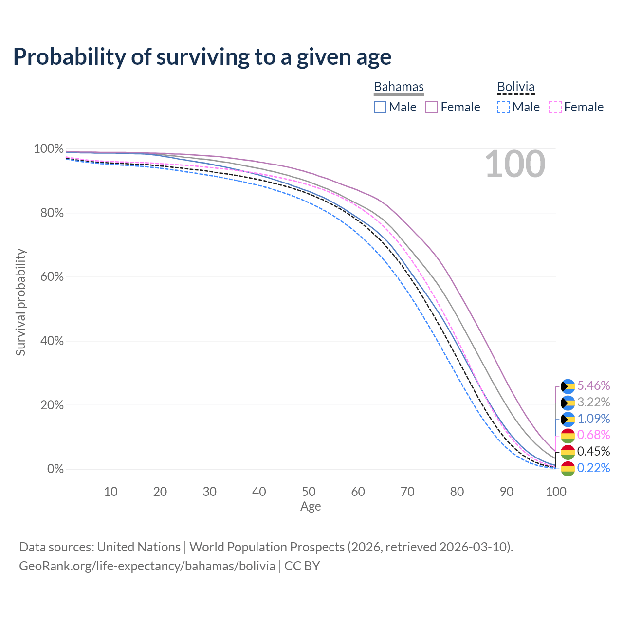 This life expectancy calculator shows the odds of living to 100, 95, 90, and below based on current age for both males and females in the Bahamas and Bolivia, along with mean and median age of death. The calculations are based on the 2026 life tables (actuarial tables) from the UN World Population Prospects.