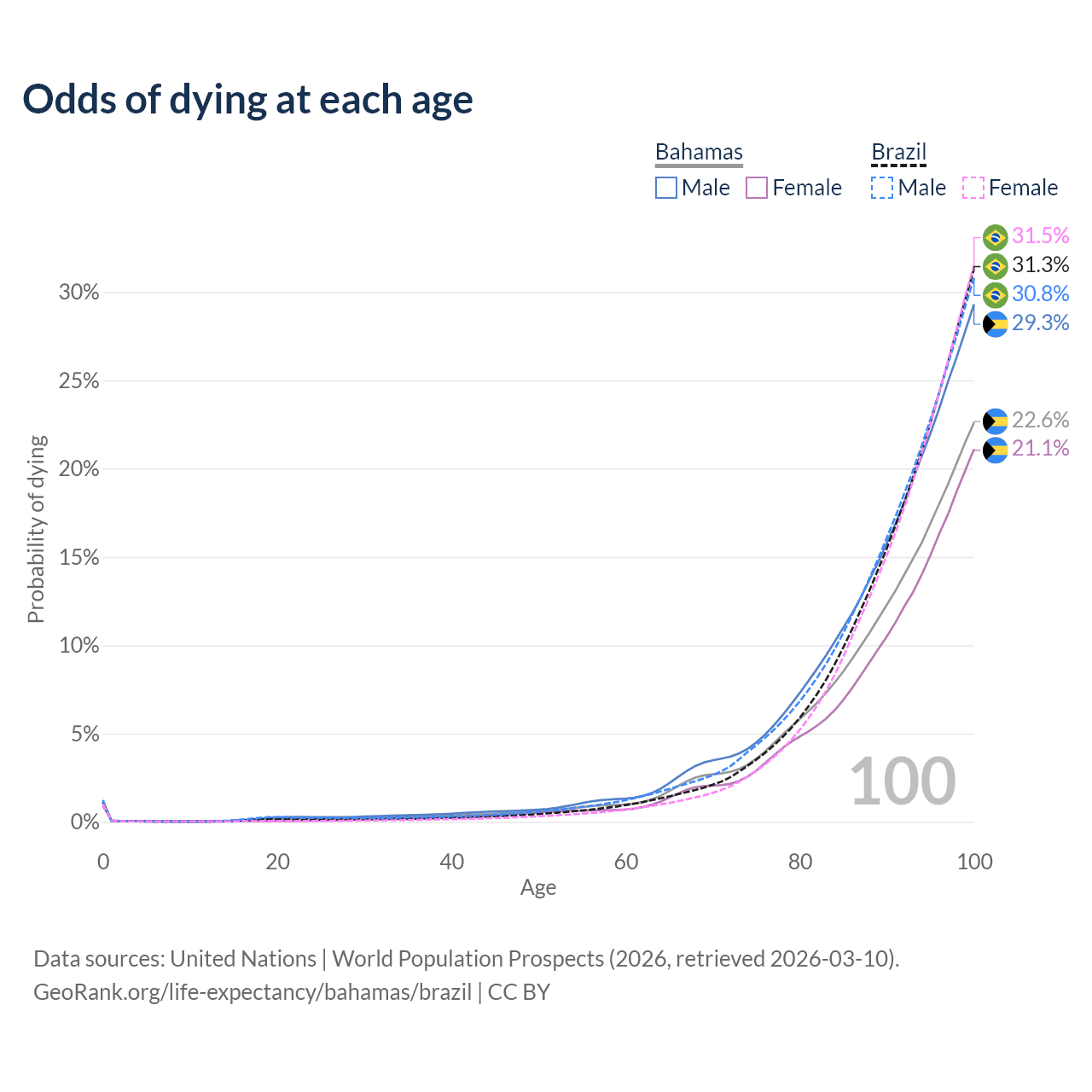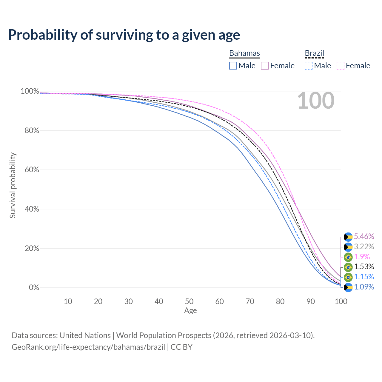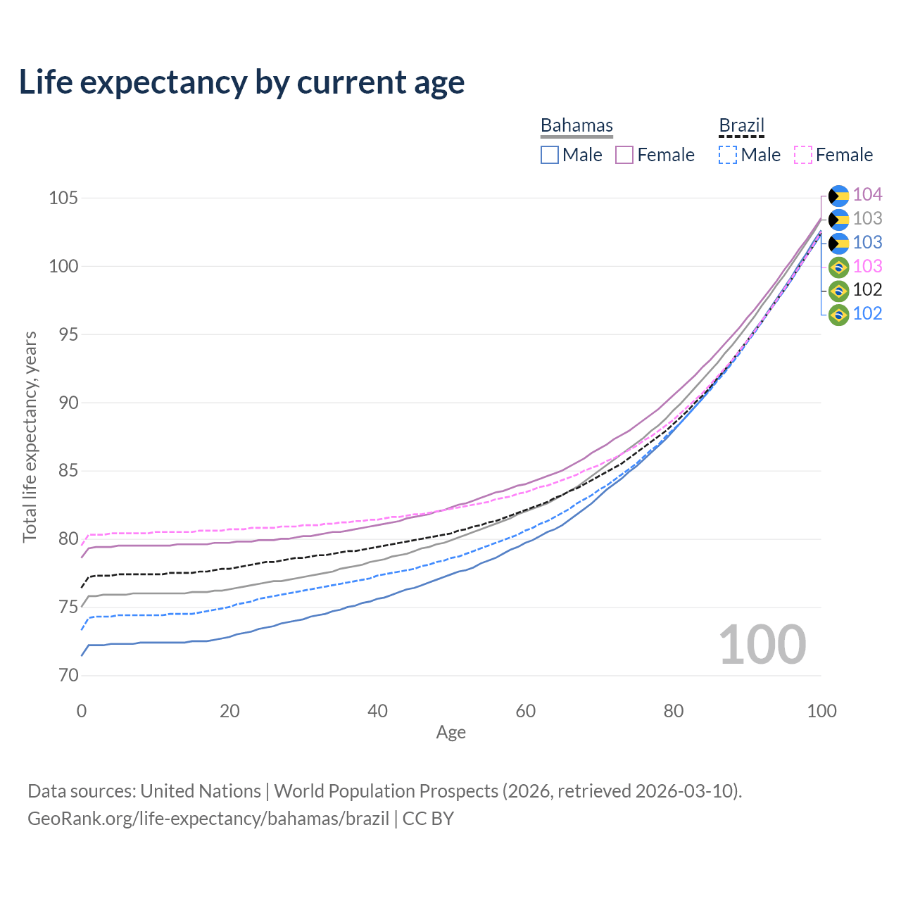 This life expectancy calculator shows the odds of living to 100, 95, 90, and below based on current age for both males and females in the Bahamas and Brazil, along with mean and median age of death. The calculations are based on the 2026 life tables (actuarial tables) from the UN World Population Prospects.
