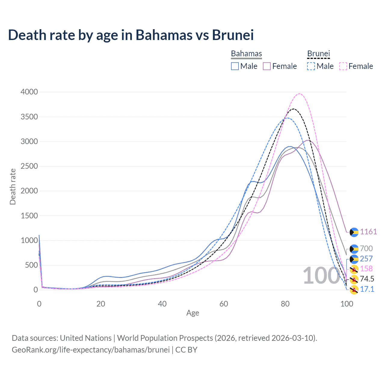 In the Bahamas, the most common age of death is 84, compared to 83 in Brunei. The median age of death is 79.2 in the Bahamas and 79.2 in Brunei, meaning only half of each cohort is expected to live past that age.