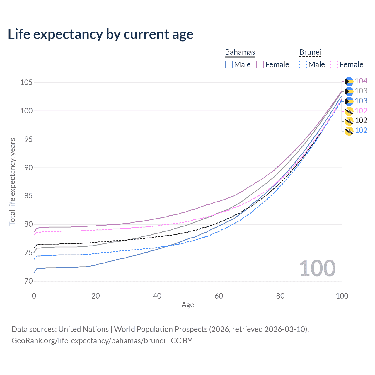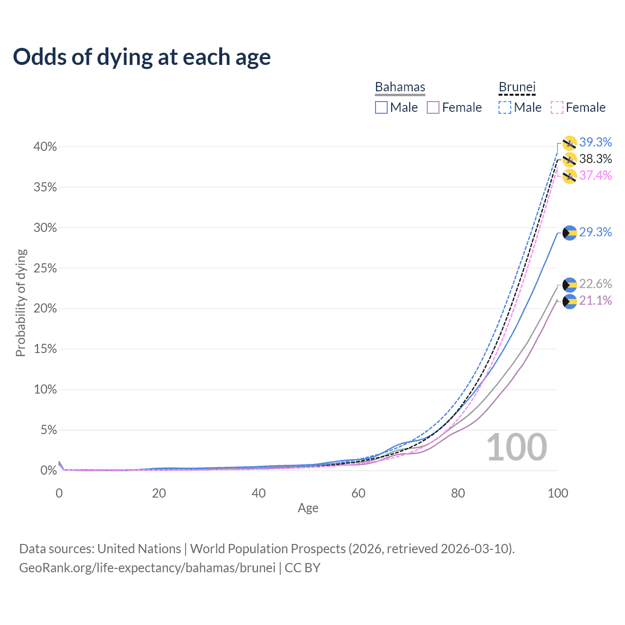 This life expectancy calculator shows the odds of living to 100, 95, 90, and below based on current age for both males and females in the Bahamas and Brunei, along with mean and median age of death. The calculations are based on the 2026 life tables (actuarial tables) from the UN World Population Prospects.