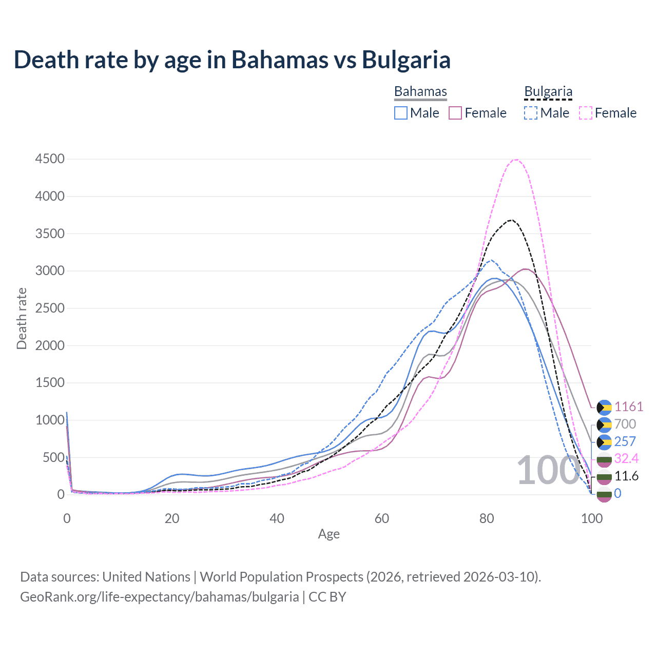 In the Bahamas, the most common age of death is 84, compared to 85 in Bulgaria. The median age of death is 79.2 in the Bahamas and 79.5 in Bulgaria, meaning only half of each cohort is expected to live past that age.
