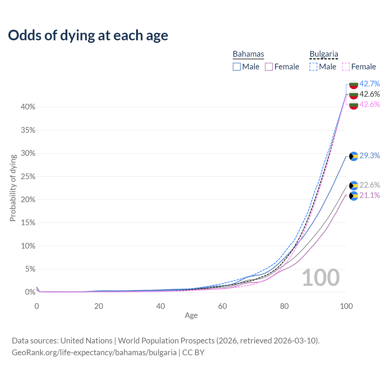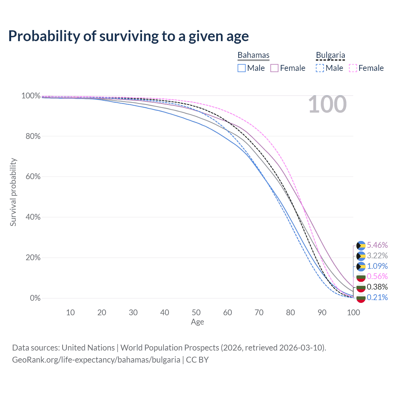 This life expectancy calculator shows the odds of living to 100, 95, 90, and below based on current age for both males and females in the Bahamas and Bulgaria, along with mean and median age of death. The calculations are based on the 2026 life tables (actuarial tables) from the UN World Population Prospects.