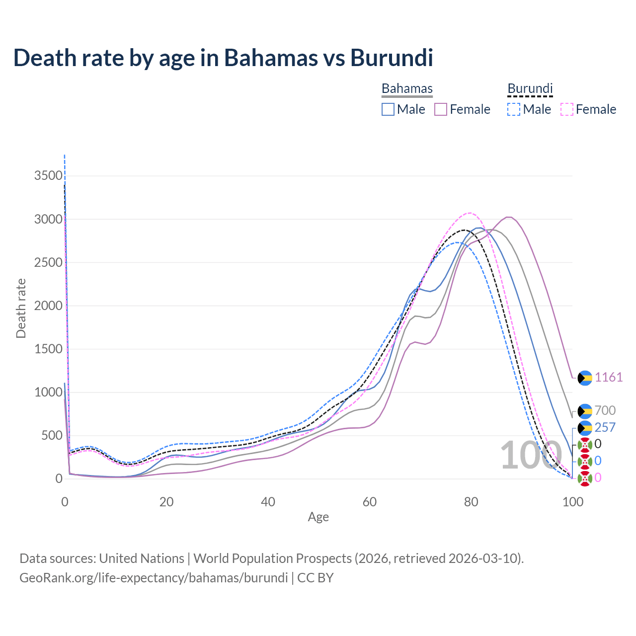 The average life expectancy at birth is 75 years in the Bahamas vs 64.1 in Burundi. The Bahamas is ranked 95/197 by life expectancy, and Burundi is 179/197. In the Bahamas, the life expectancy is 71.4 years for males and 78.6 years for females. In Burundi, it's 62 years for males and 66.2 years for females.