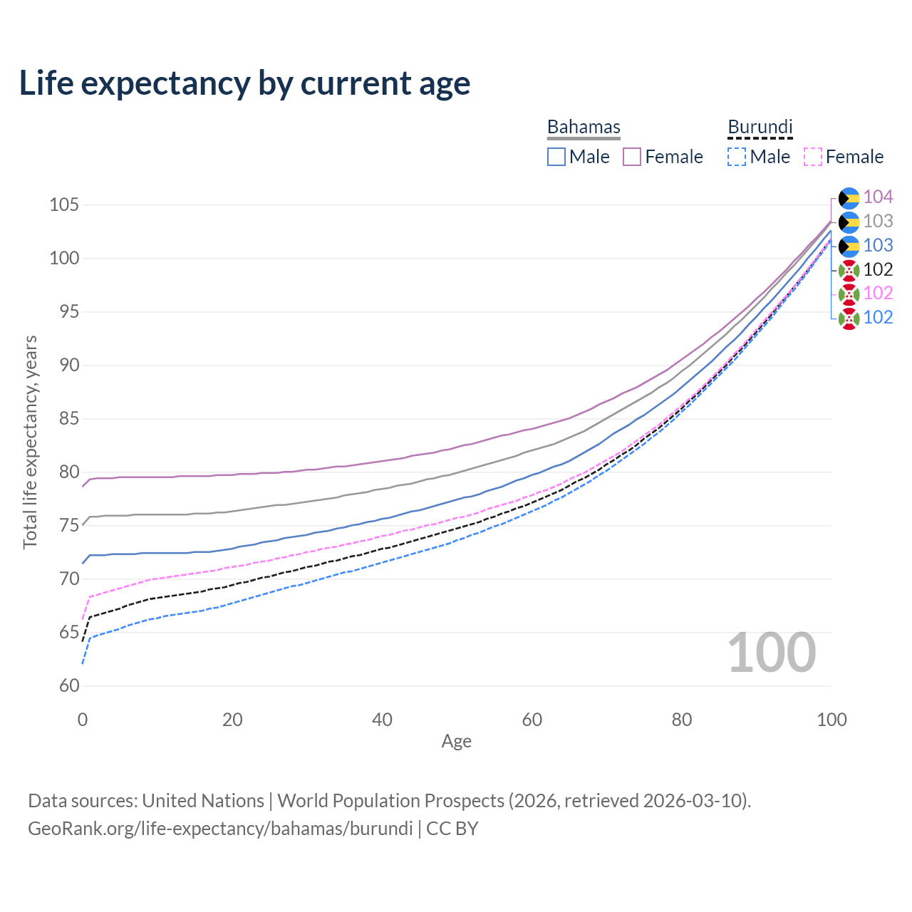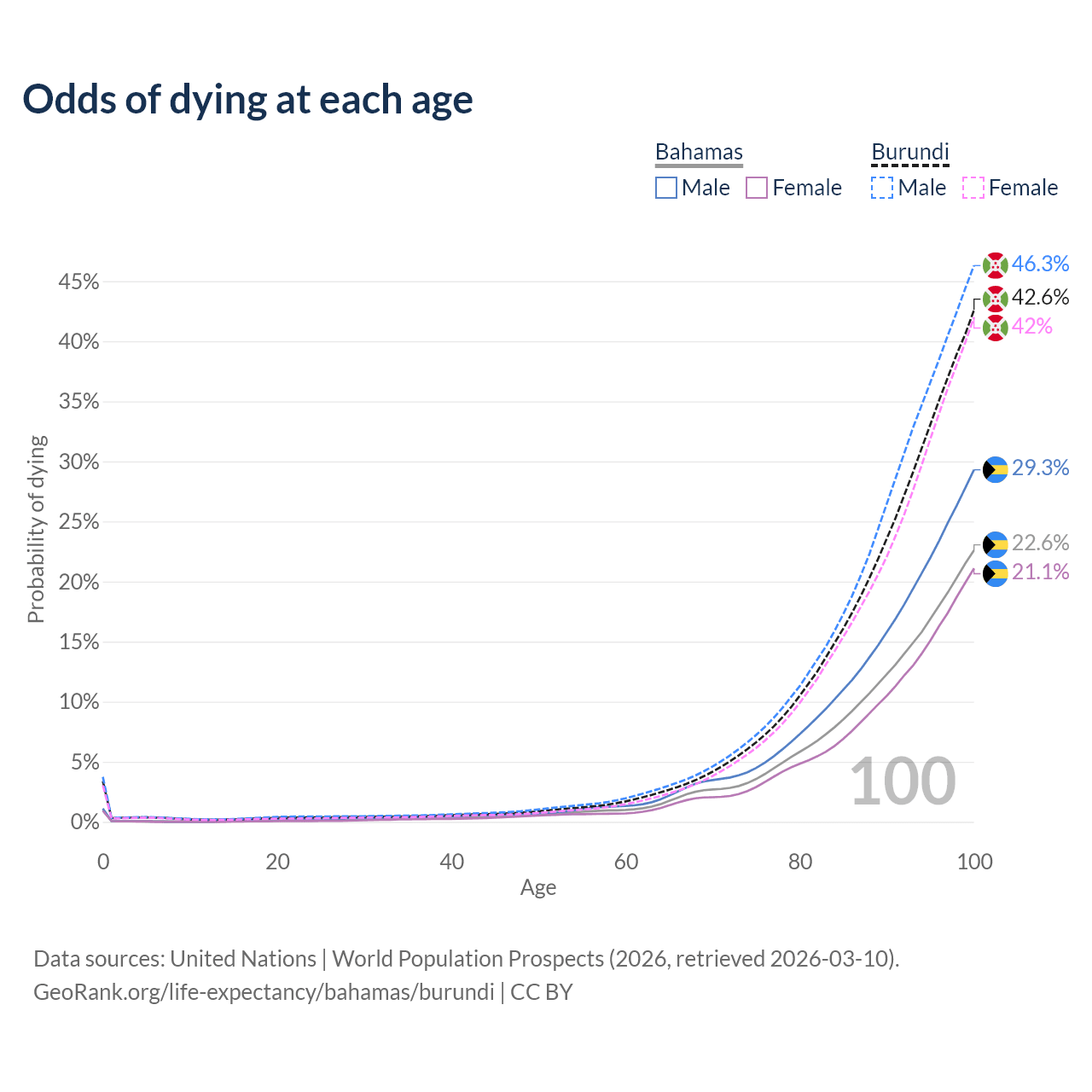 This life expectancy calculator shows the odds of living to 100, 95, 90, and below based on current age for both males and females in the Bahamas and Burundi, along with mean and median age of death. The calculations are based on the 2026 life tables (actuarial tables) from the UN World Population Prospects.