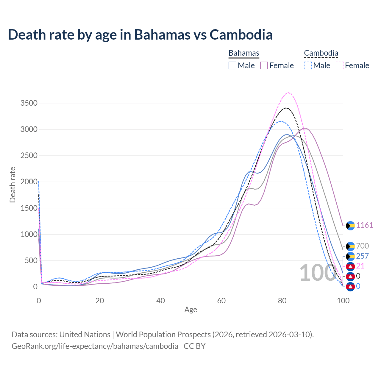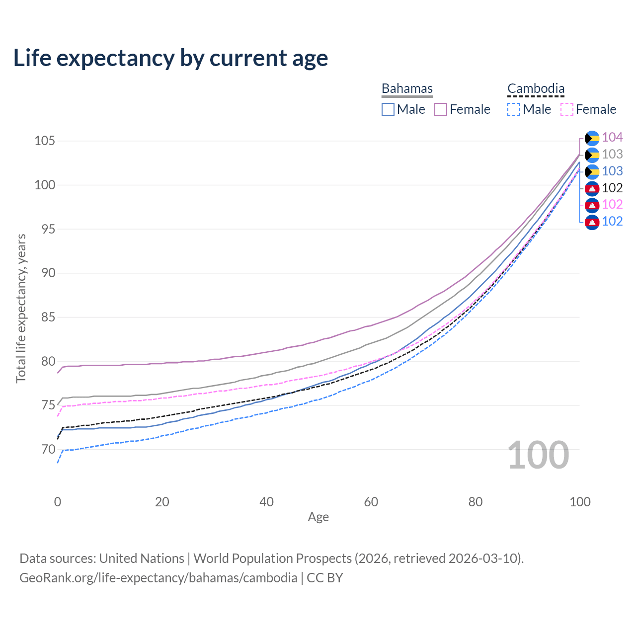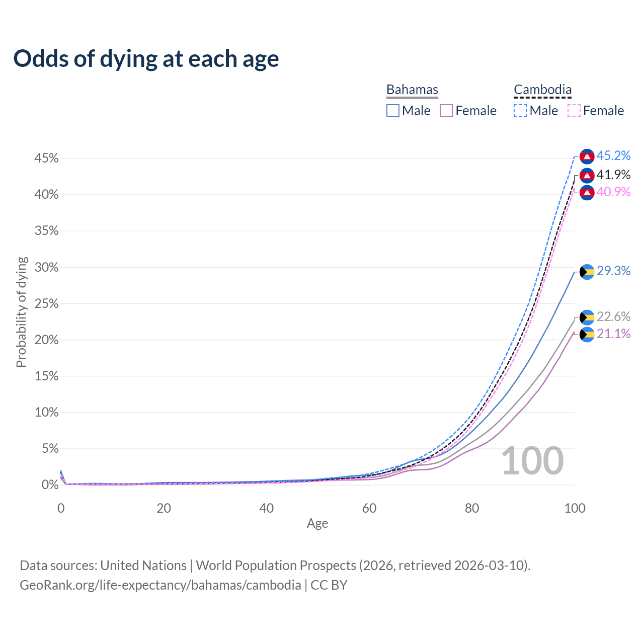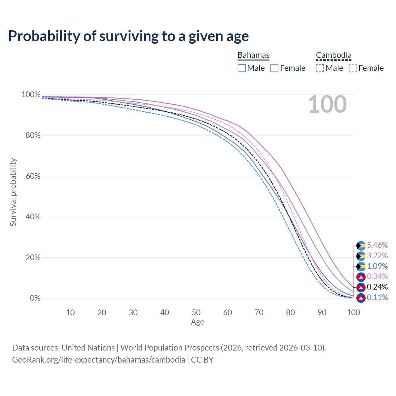 This life expectancy calculator shows the odds of living to 100, 95, 90, and below based on current age for both males and females in the Bahamas and Cambodia, along with mean and median age of death. The calculations are based on the 2026 life tables (actuarial tables) from the UN World Population Prospects.