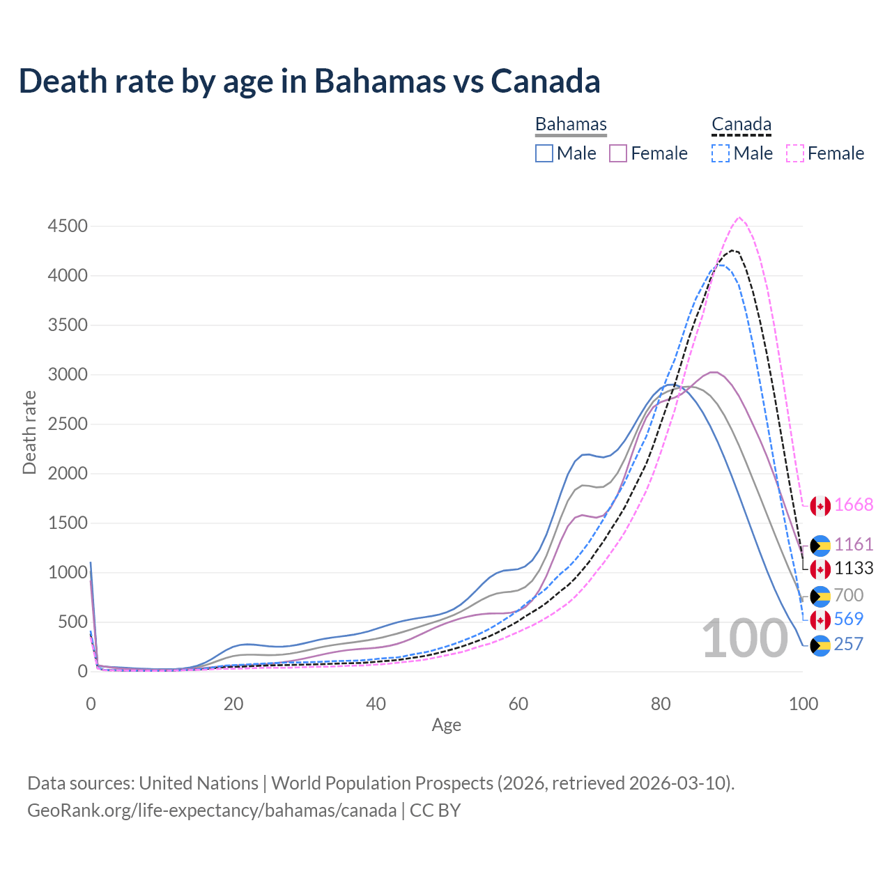 In the Bahamas, the most common age of death is 84, compared to 90 in Canada. The median age of death is 79.2 in the Bahamas and 86.4 in Canada, meaning only half of each cohort is expected to live past that age.