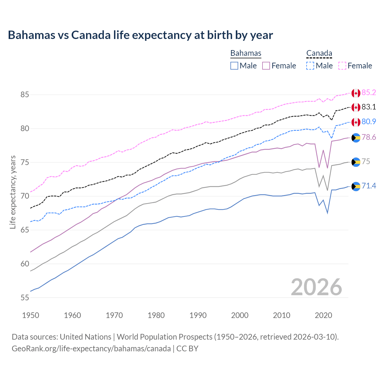The average life expectancy at birth is 75 years in the Bahamas vs 83.1 in Canada. The Bahamas is ranked 95/197 by life expectancy, and Canada is 19/197. In the Bahamas, the life expectancy is 71.4 years for males and 78.6 years for females. In Canada, it's 80.9 years for males and 85.2 years for females.