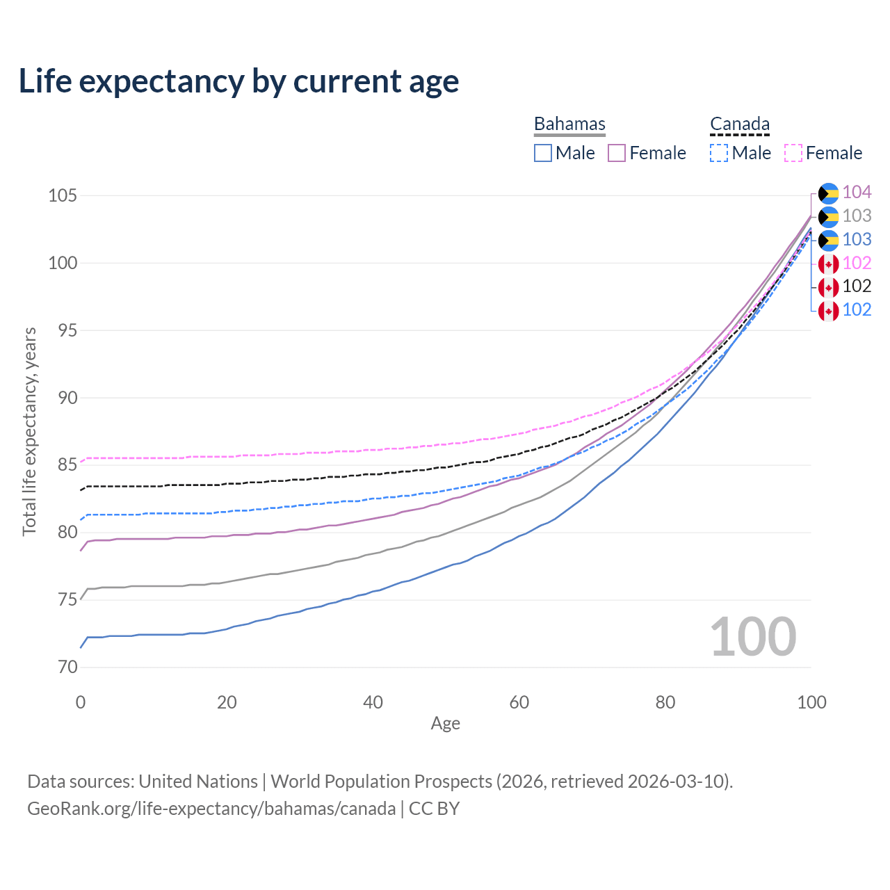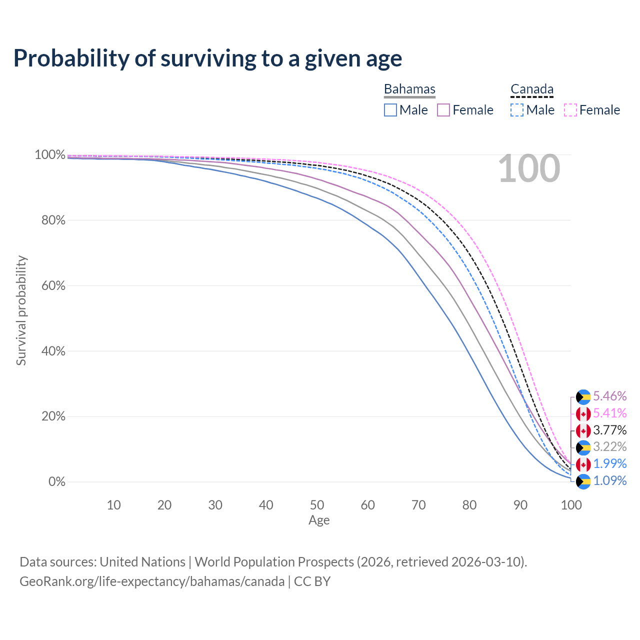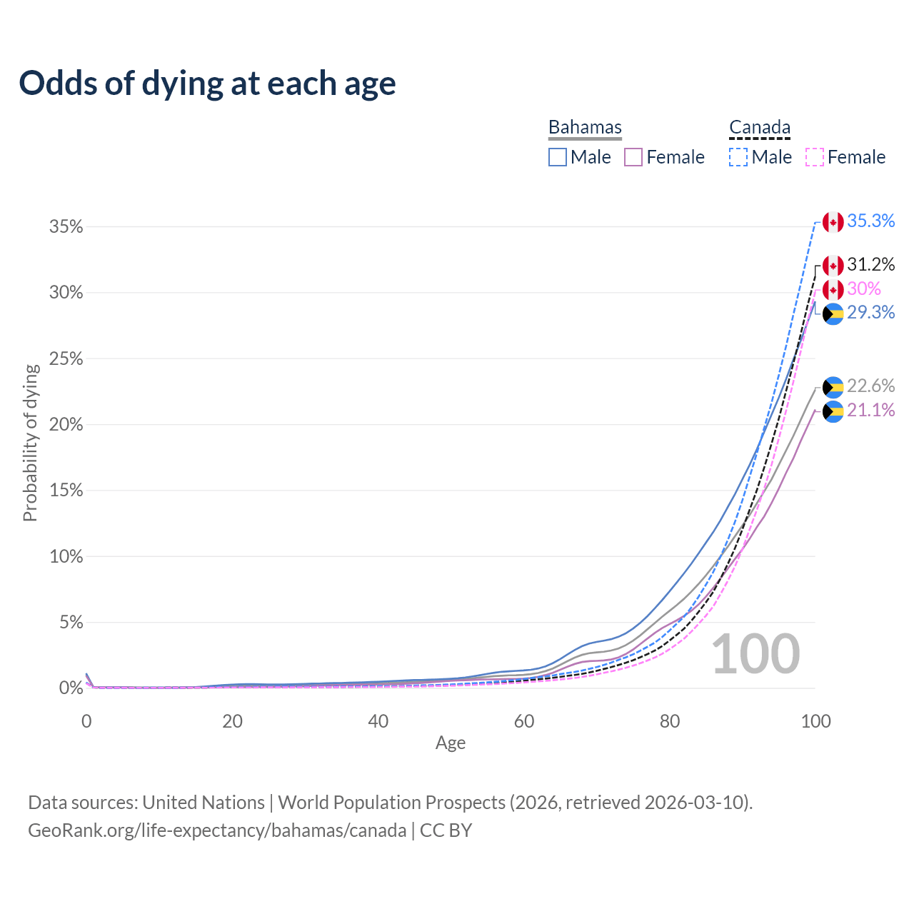 This life expectancy calculator shows the odds of living to 100, 95, 90, and below based on current age for both males and females in the Bahamas and Canada, along with mean and median age of death. The calculations are based on the 2026 life tables (actuarial tables) from the UN World Population Prospects.