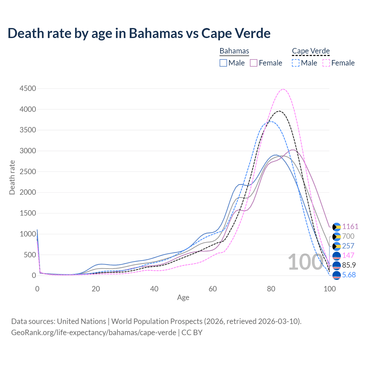 In the Bahamas, the most common age of death is 84, compared to 83 in Cape Verde. The median age of death is 79.2 in the Bahamas and 80.1 in Cape Verde, meaning only half of each cohort is expected to live past that age.