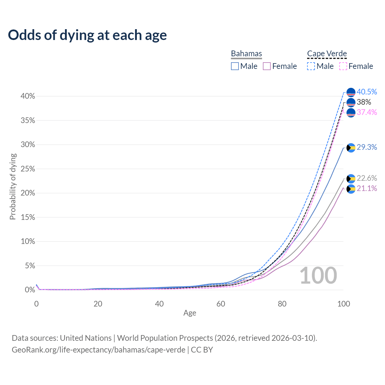 This life expectancy calculator shows the odds of living to 100, 95, 90, and below based on current age for both males and females in the Bahamas and Cape Verde, along with mean and median age of death. The calculations are based on the 2026 life tables (actuarial tables) from the UN World Population Prospects.
