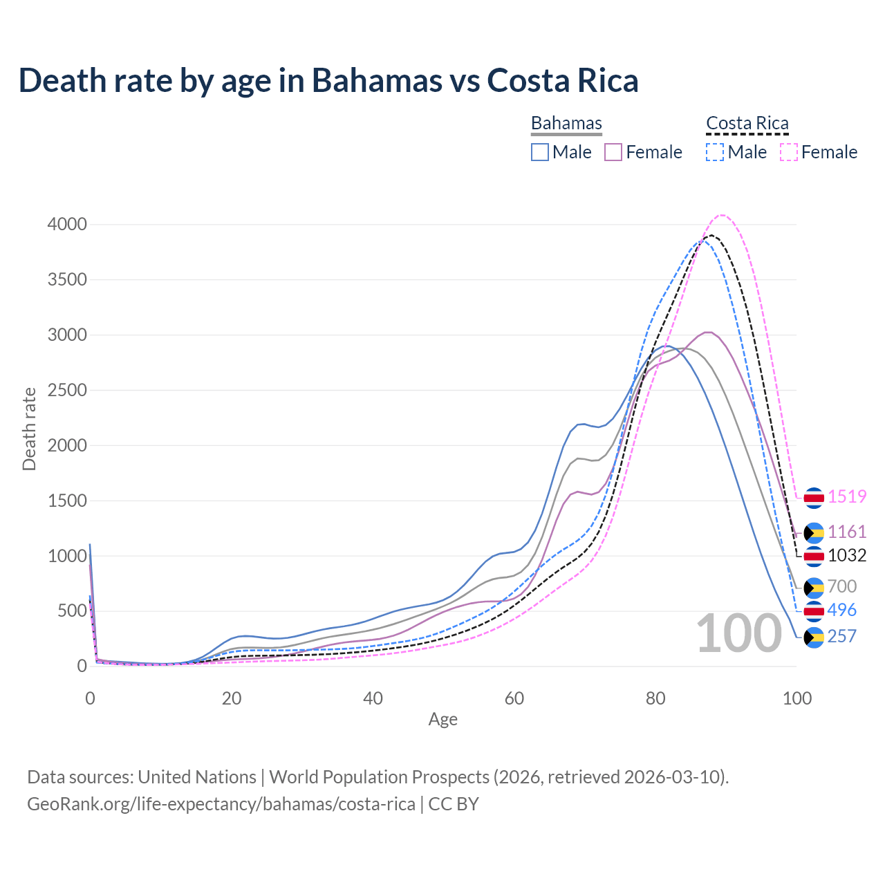 In the Bahamas, the most common age of death is 84, compared to 88 in Costa Rica. The median age of death is 79.2 in the Bahamas and 85 in Costa Rica, meaning only half of each cohort is expected to live past that age.