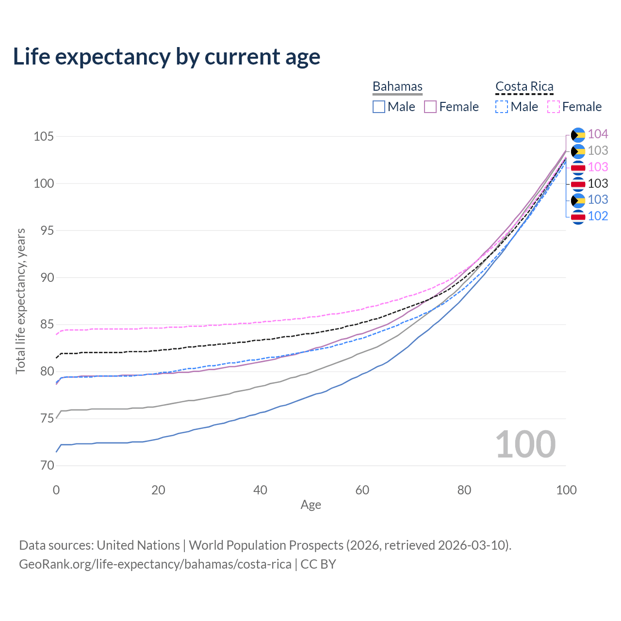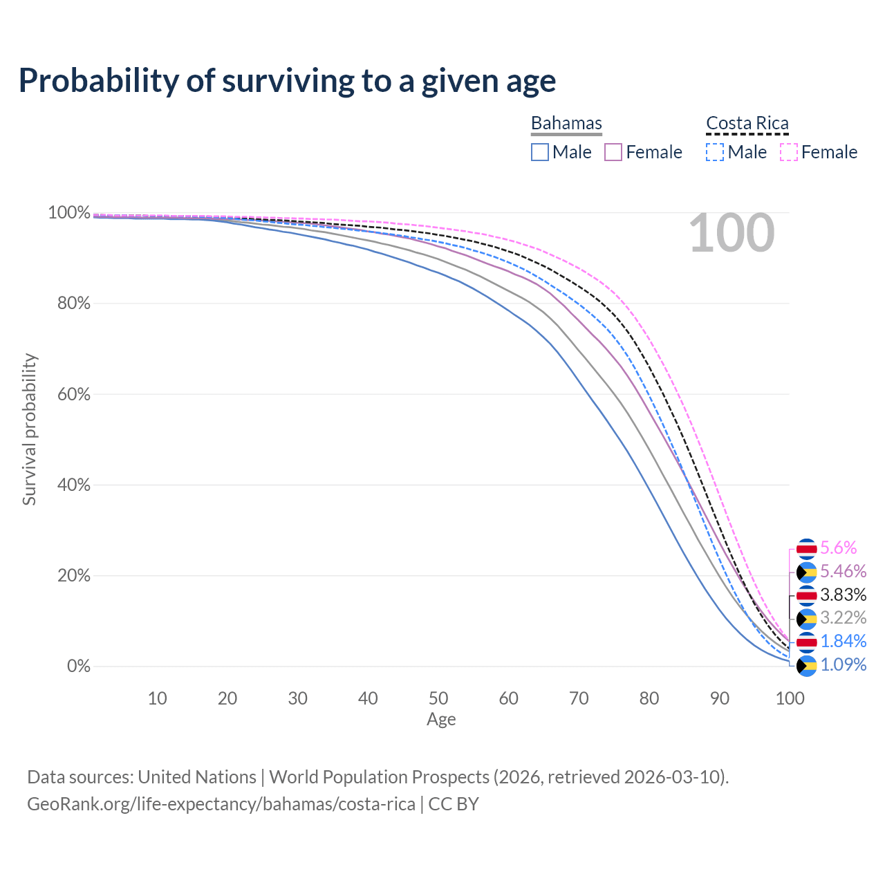 This life expectancy calculator shows the odds of living to 100, 95, 90, and below based on current age for both males and females in the Bahamas and Costa Rica, along with mean and median age of death. The calculations are based on the 2026 life tables (actuarial tables) from the UN World Population Prospects.