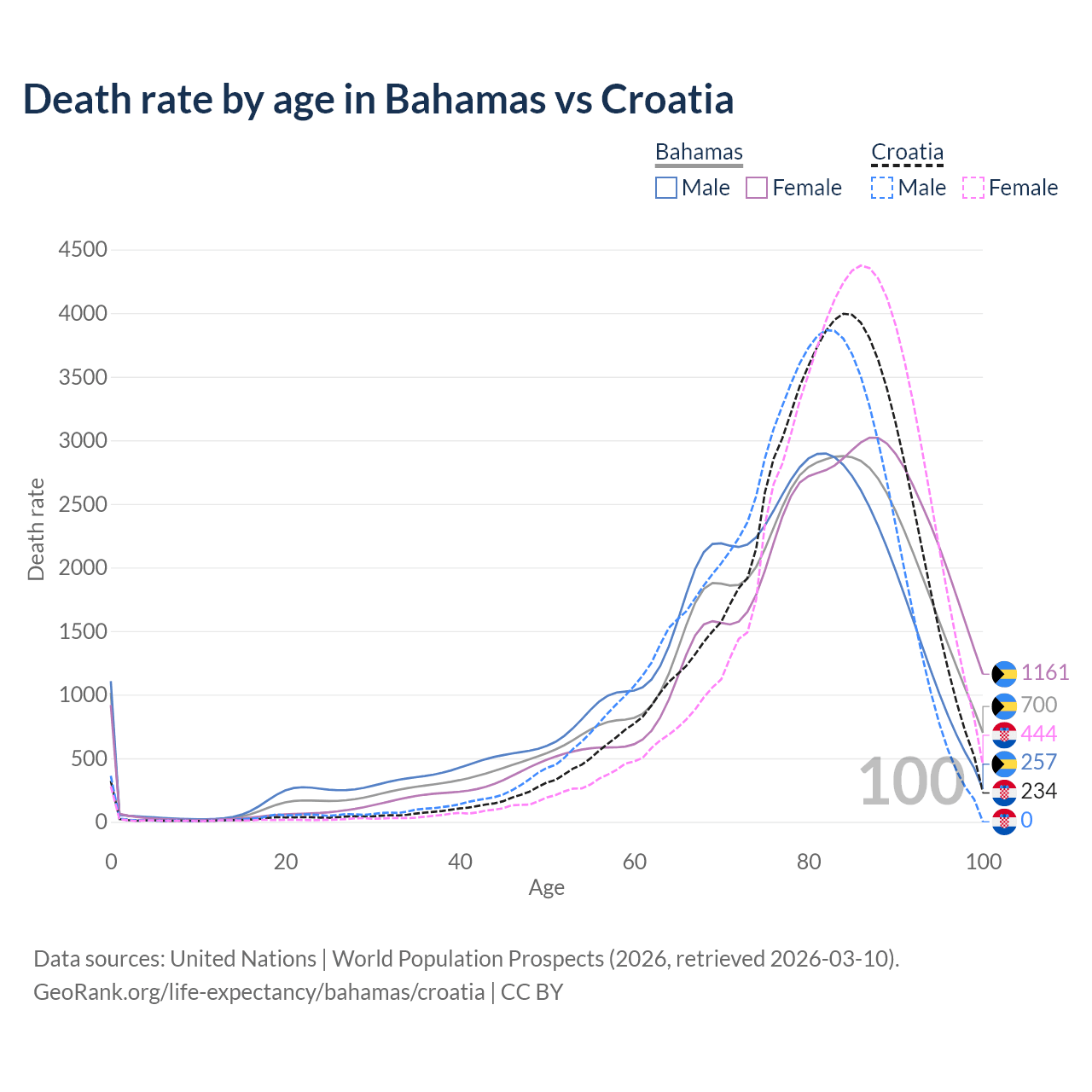 In the Bahamas, the most common age of death is 84, compared to 84 in Croatia. The median age of death is 79.2 in the Bahamas and 81.7 in Croatia, meaning only half of each cohort is expected to live past that age.