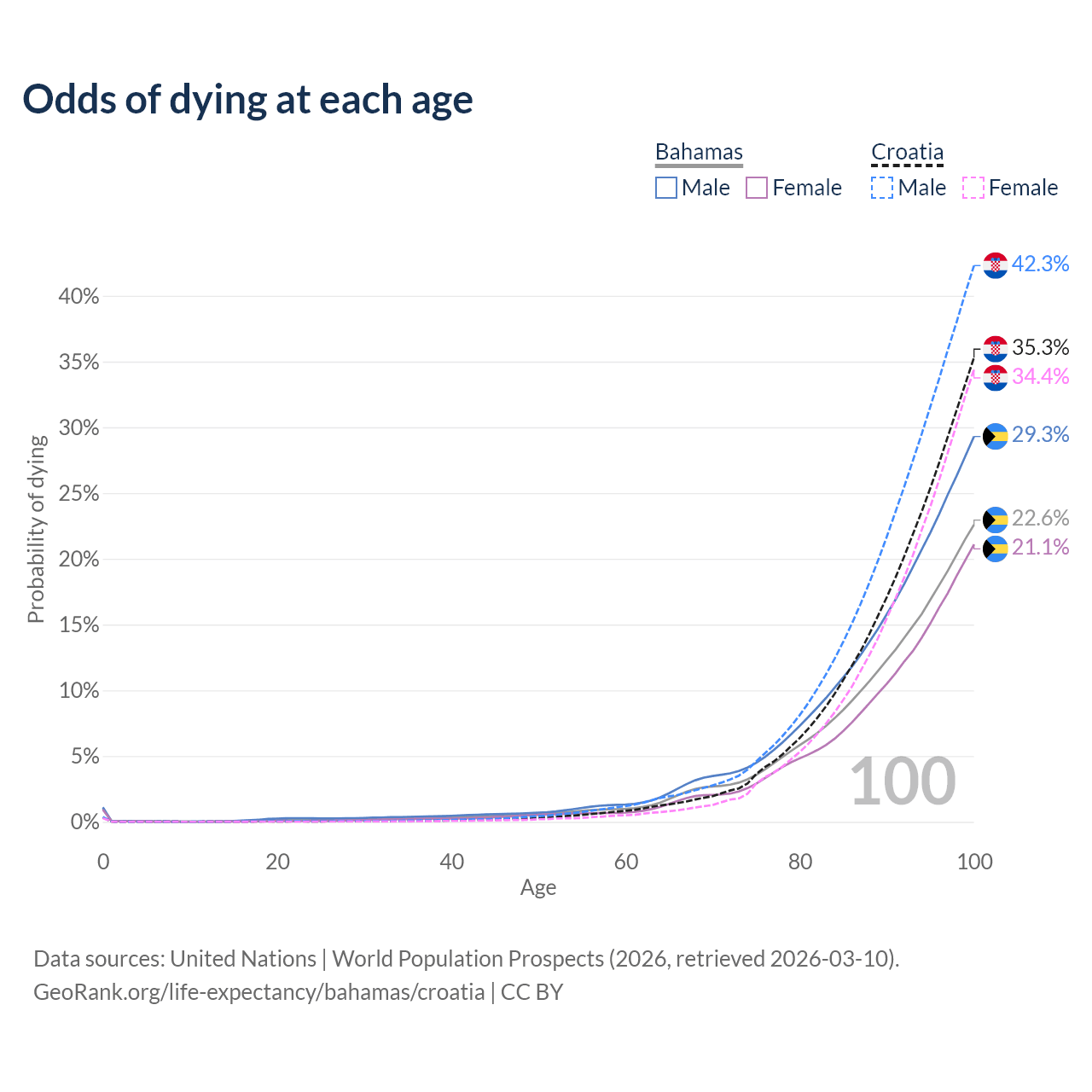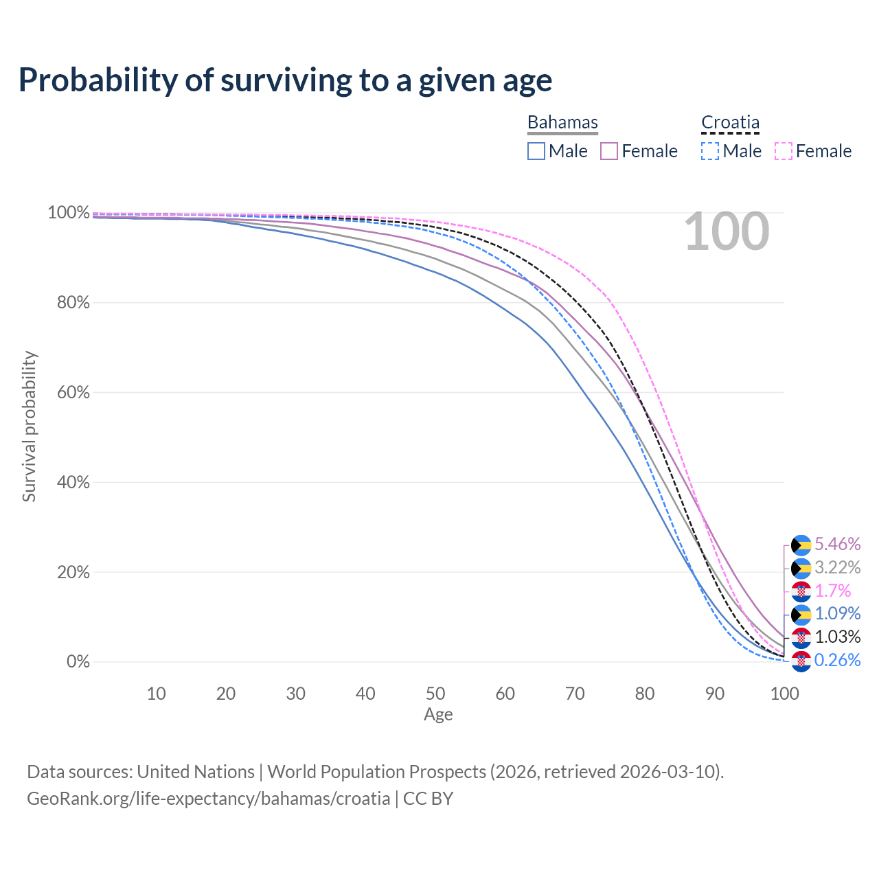 This life expectancy calculator shows the odds of living to 100, 95, 90, and below based on current age for both males and females in the Bahamas and Croatia, along with mean and median age of death. The calculations are based on the 2026 life tables (actuarial tables) from the UN World Population Prospects.