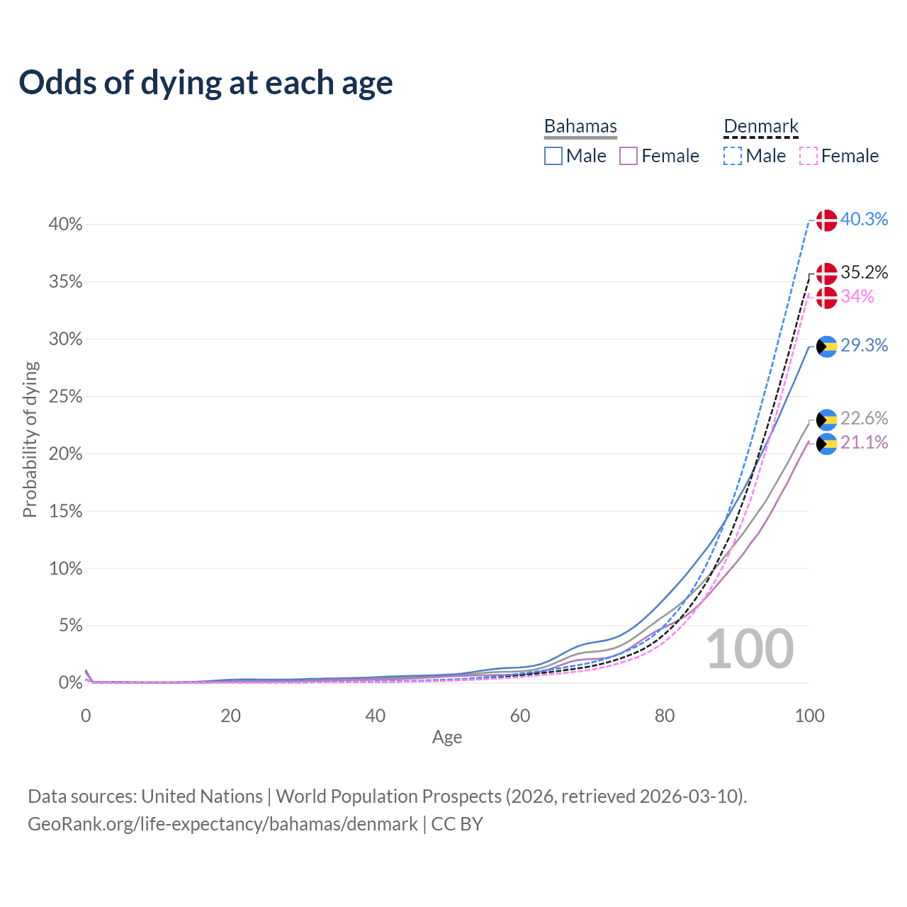 This life expectancy calculator shows the odds of living to 100, 95, 90, and below based on current age for both males and females in the Bahamas and Denmark, along with mean and median age of death. The calculations are based on the 2026 life tables (actuarial tables) from the UN World Population Prospects.