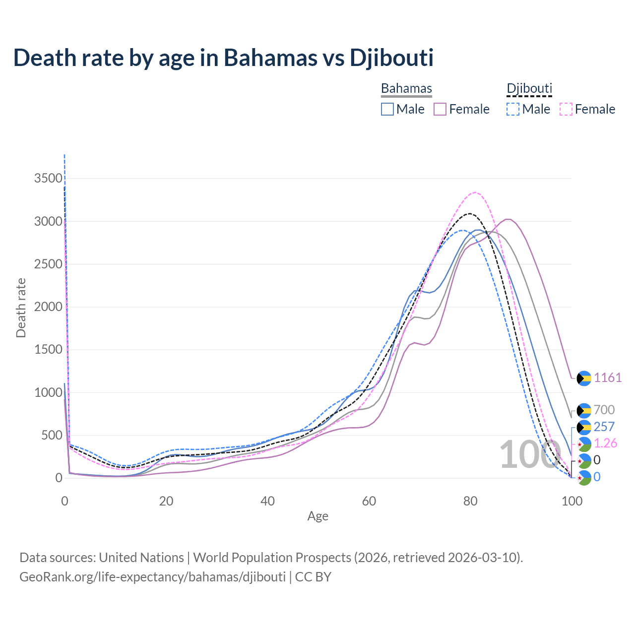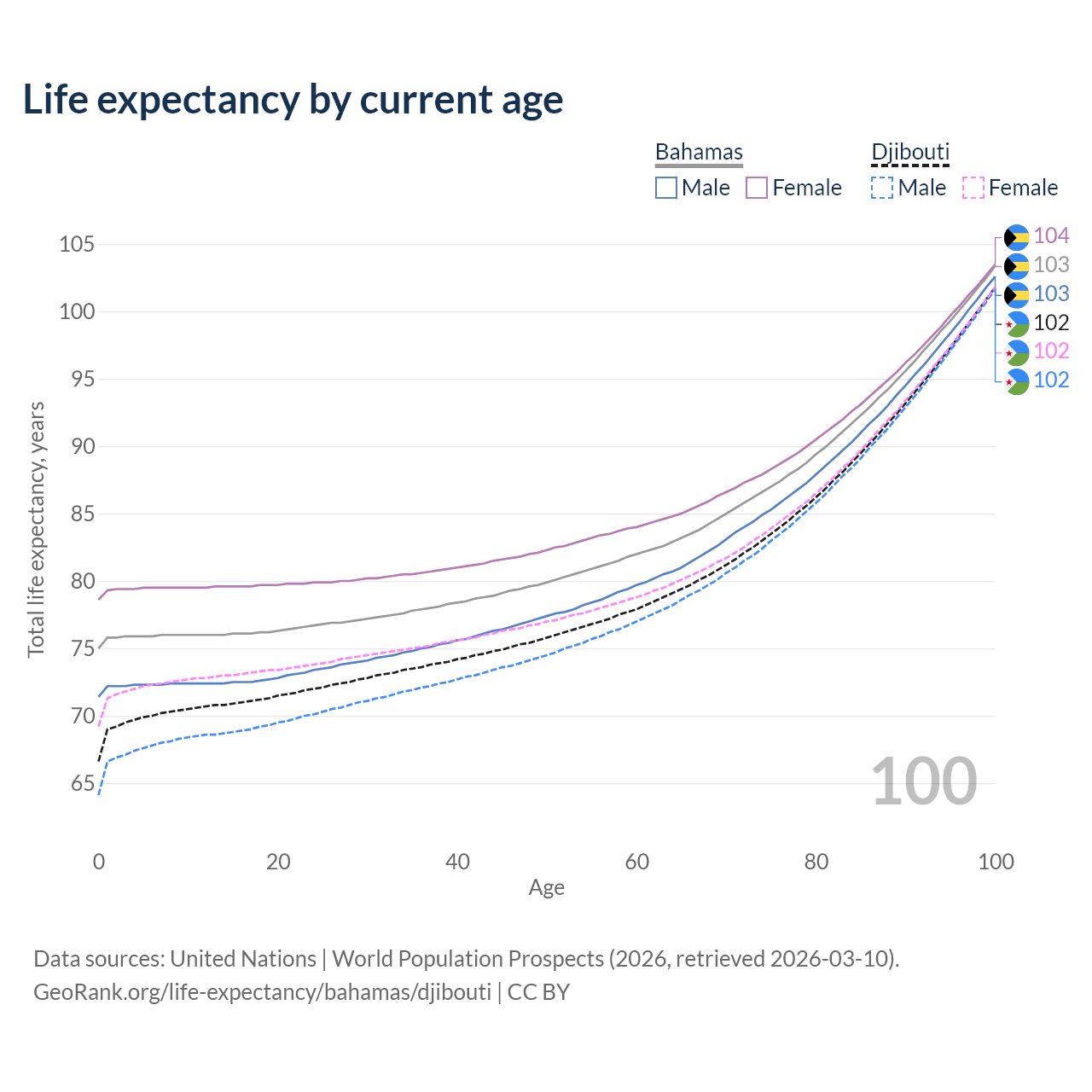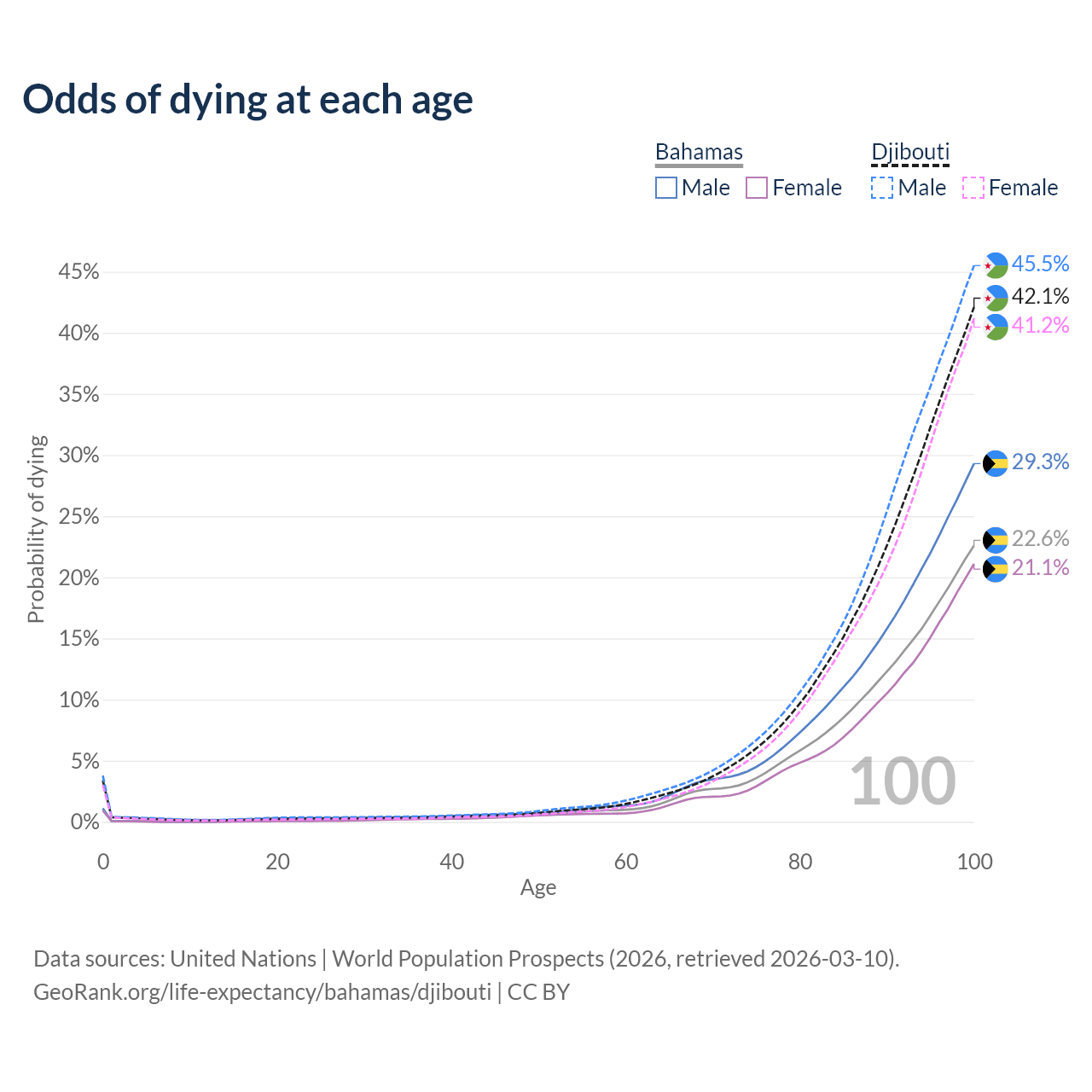 This life expectancy calculator shows the odds of living to 100, 95, 90, and below based on current age for both males and females in the Bahamas and Djibouti, along with mean and median age of death. The calculations are based on the 2026 life tables (actuarial tables) from the UN World Population Prospects.