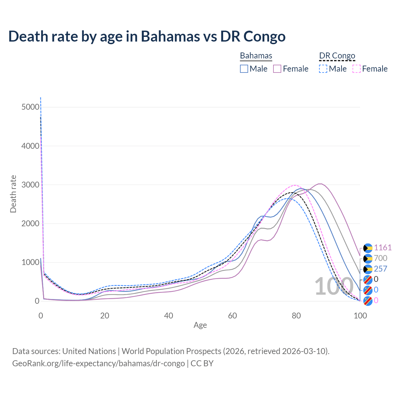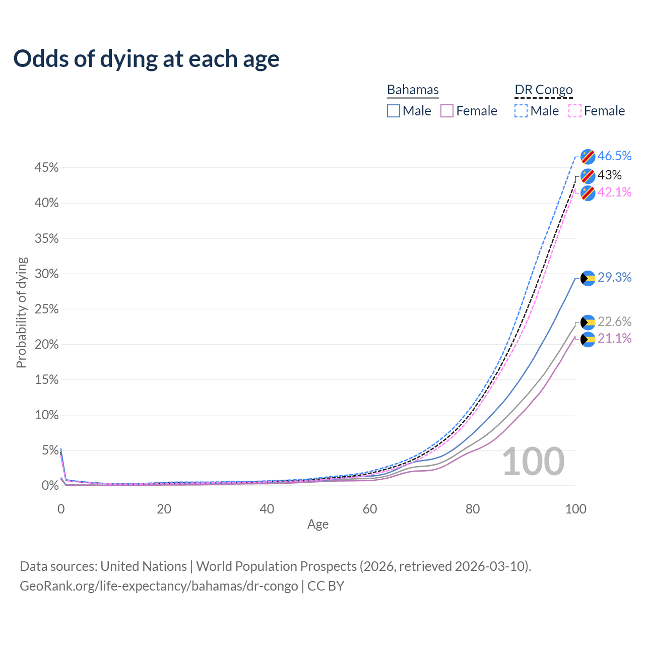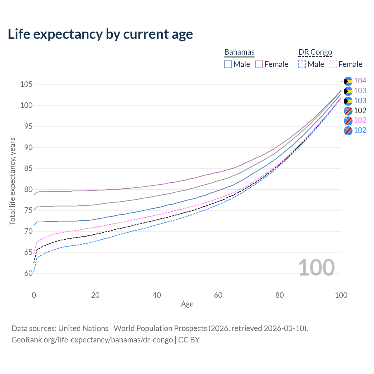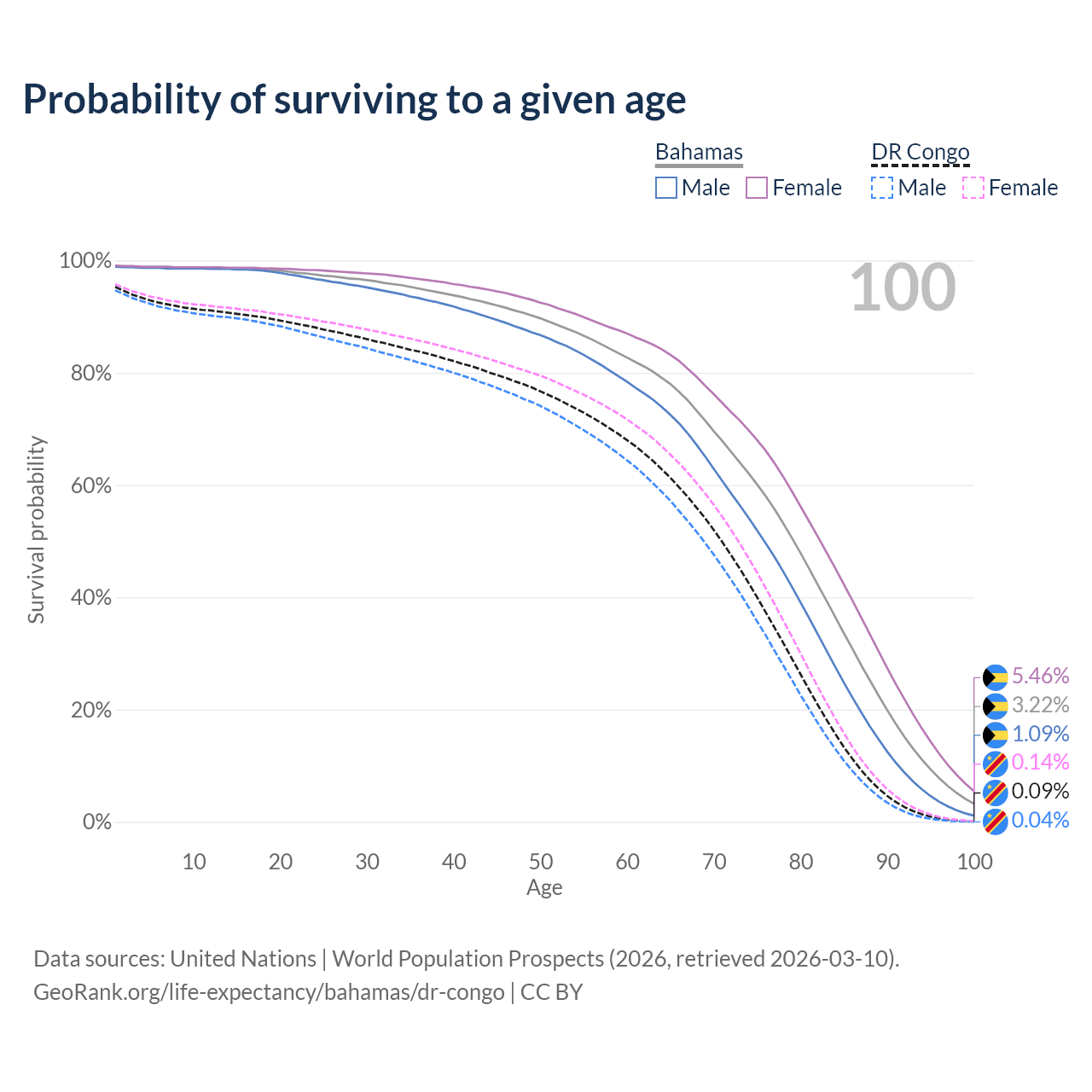 This life expectancy calculator shows the odds of living to 100, 95, 90, and below based on current age for both males and females in the Bahamas and the DR Congo, along with mean and median age of death. The calculations are based on the 2026 life tables (actuarial tables) from the UN World Population Prospects.