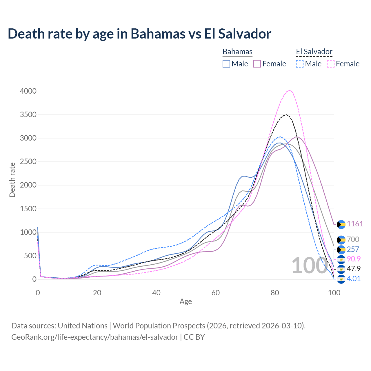 In the Bahamas, the most common age of death is 84, compared to 84 in El Salvador. The median age of death is 79.2 in the Bahamas and 78.1 in El Salvador, meaning only half of each cohort is expected to live past that age.