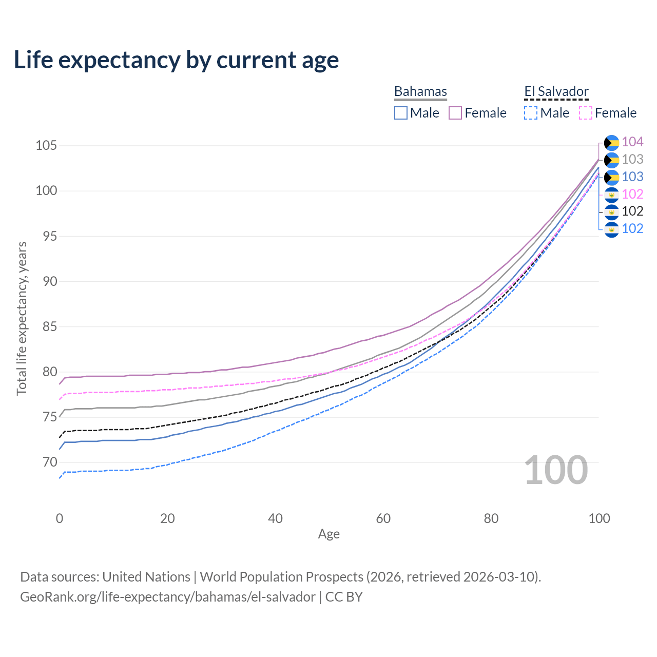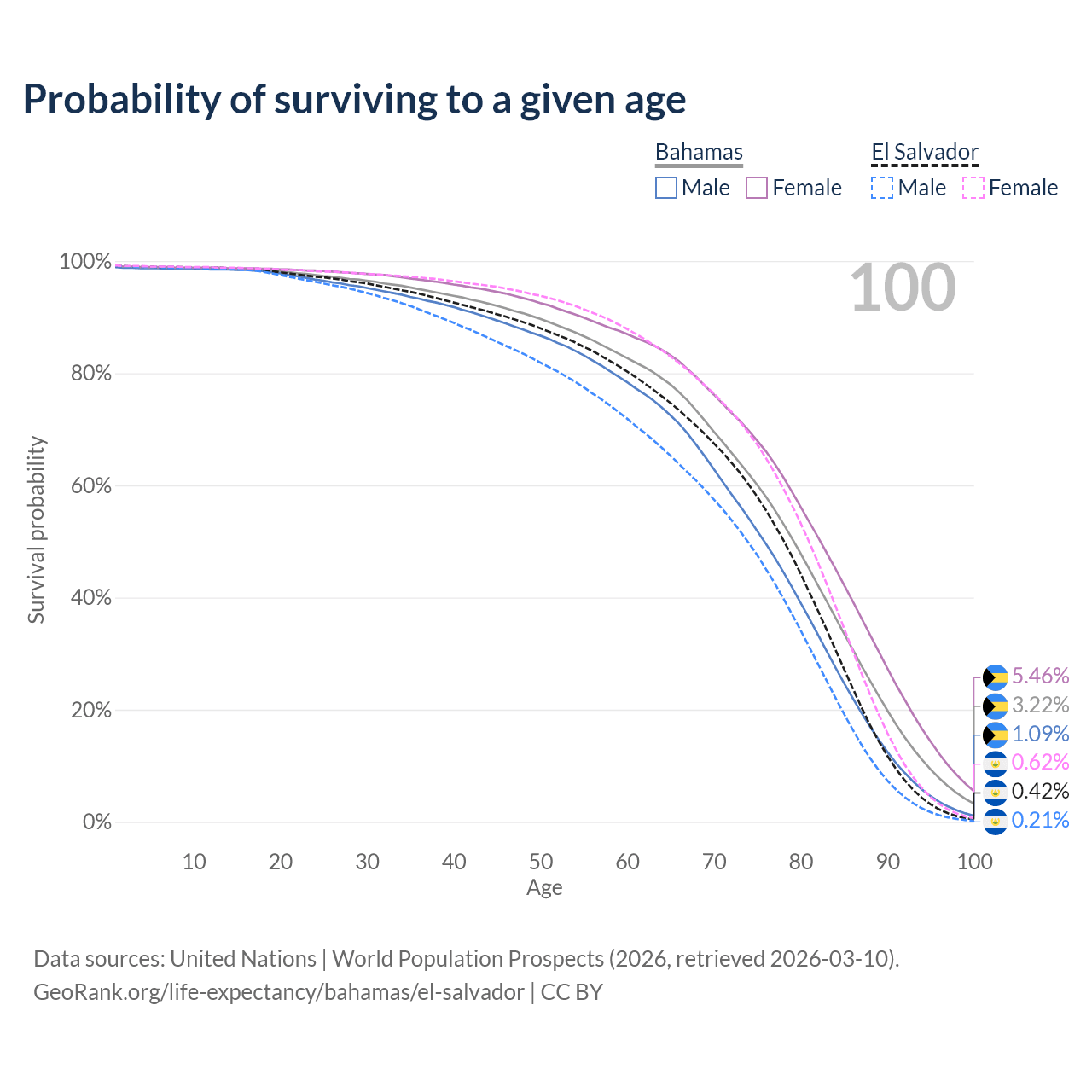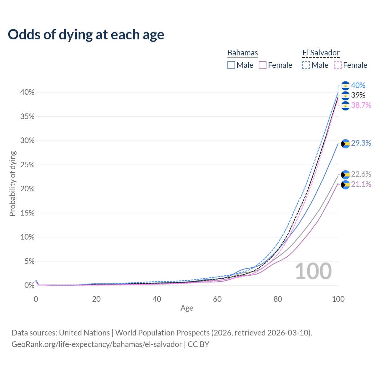 This life expectancy calculator shows the odds of living to 100, 95, 90, and below based on current age for both males and females in the Bahamas and El Salvador, along with mean and median age of death. The calculations are based on the 2026 life tables (actuarial tables) from the UN World Population Prospects.
