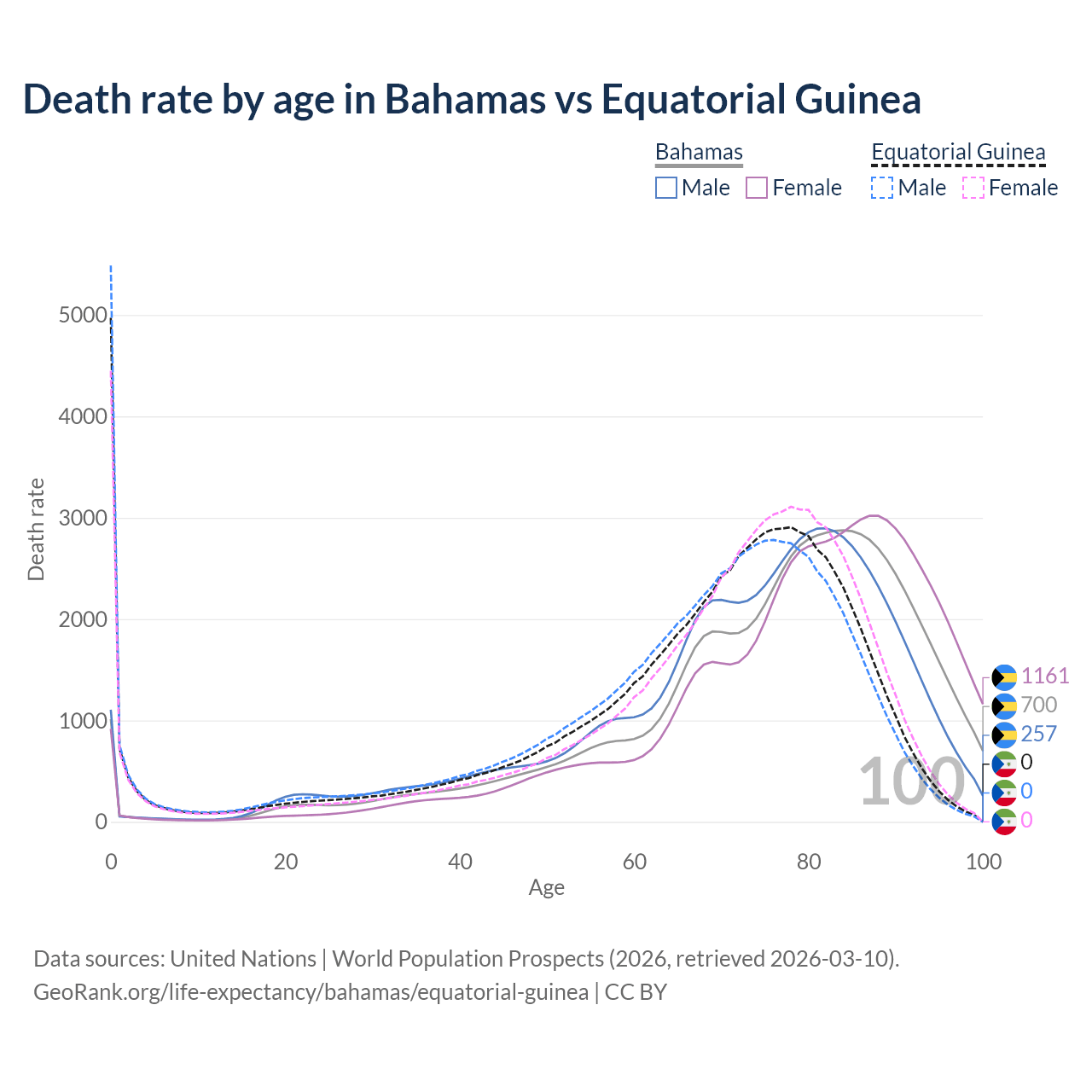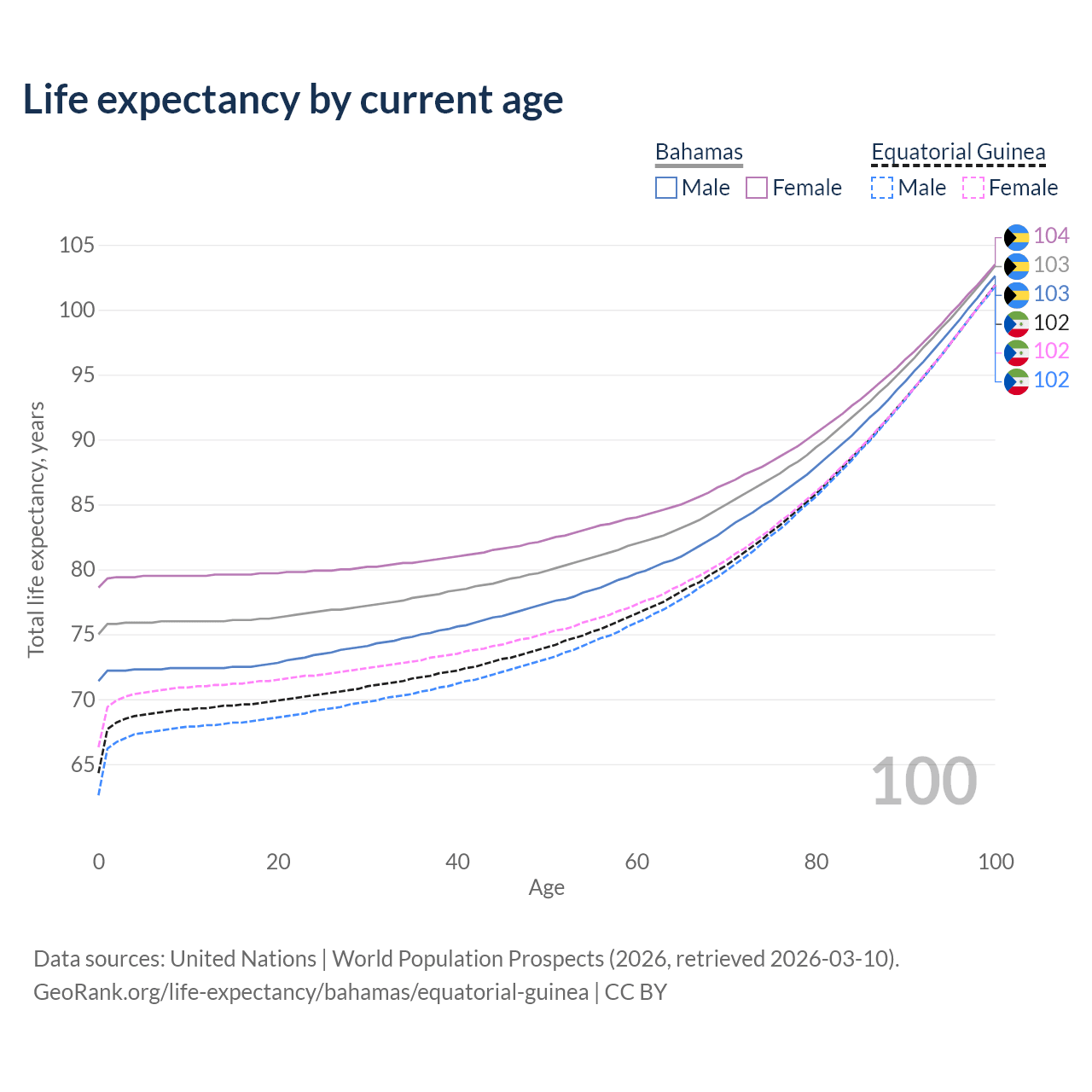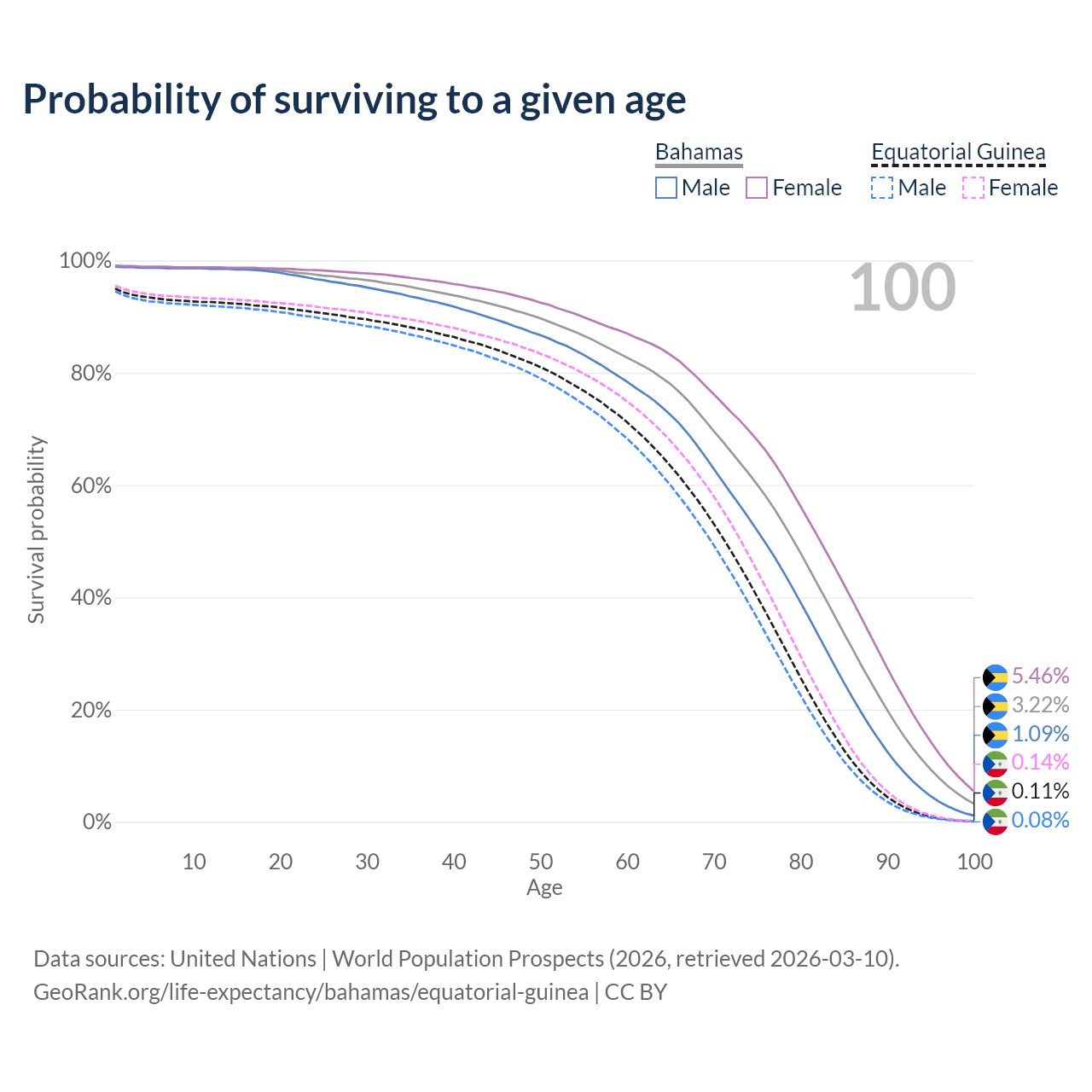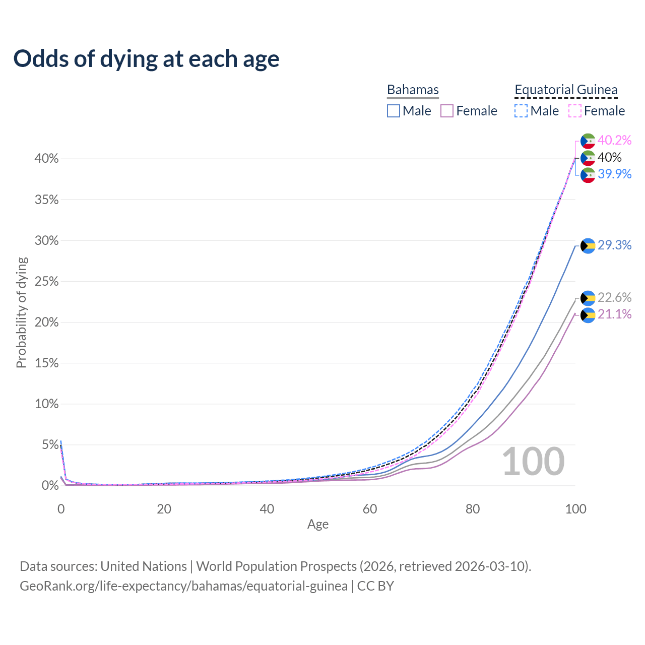 This life expectancy calculator shows the odds of living to 100, 95, 90, and below based on current age for both males and females in the Bahamas and Equatorial Guinea, along with mean and median age of death. The calculations are based on the 2026 life tables (actuarial tables) from the UN World Population Prospects.