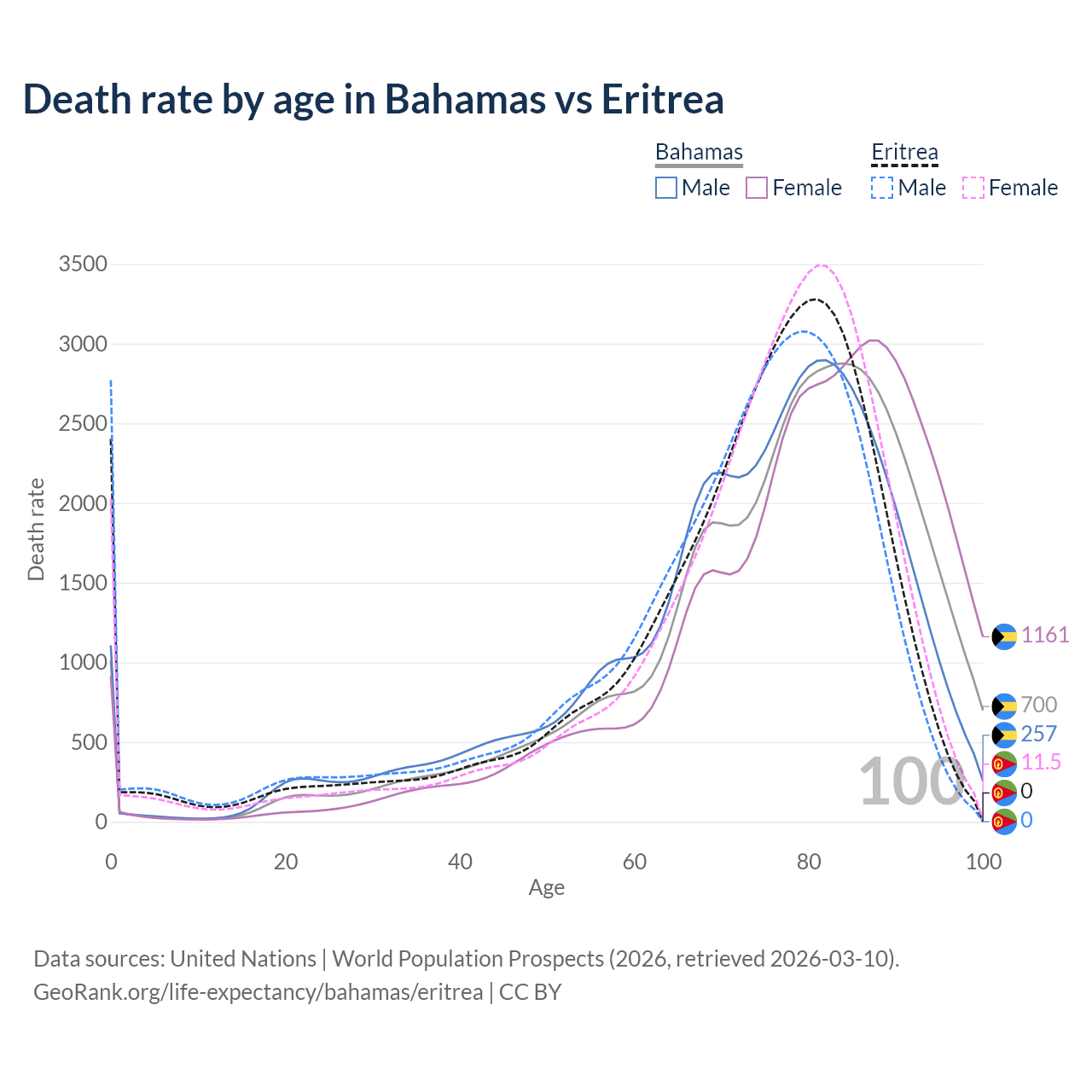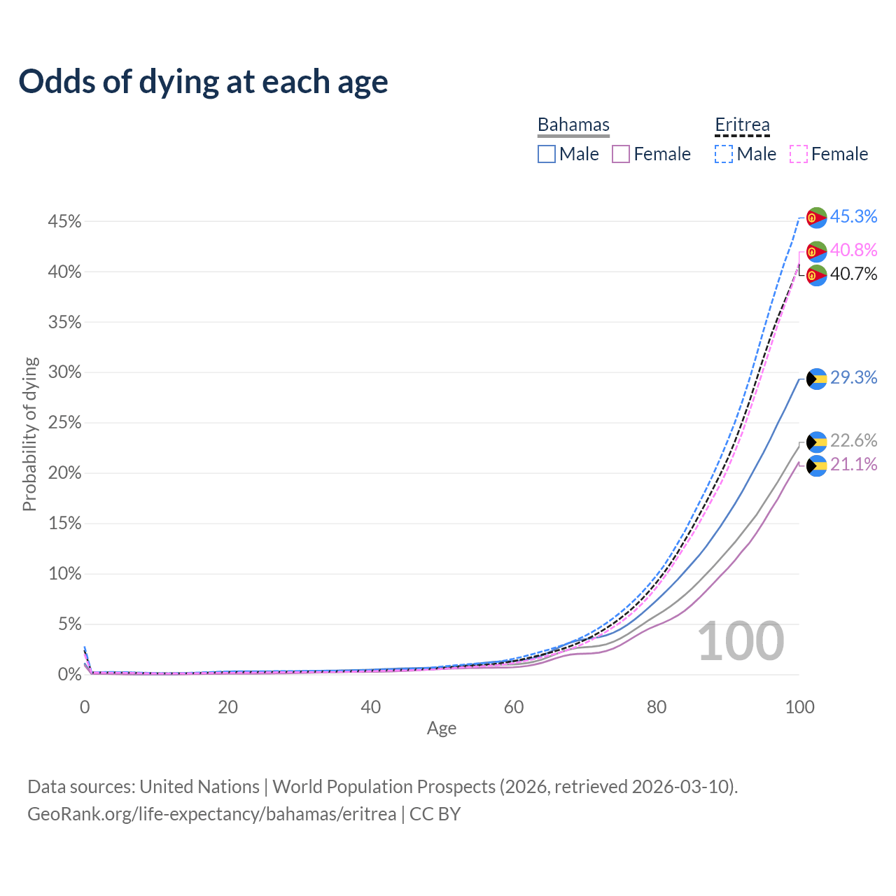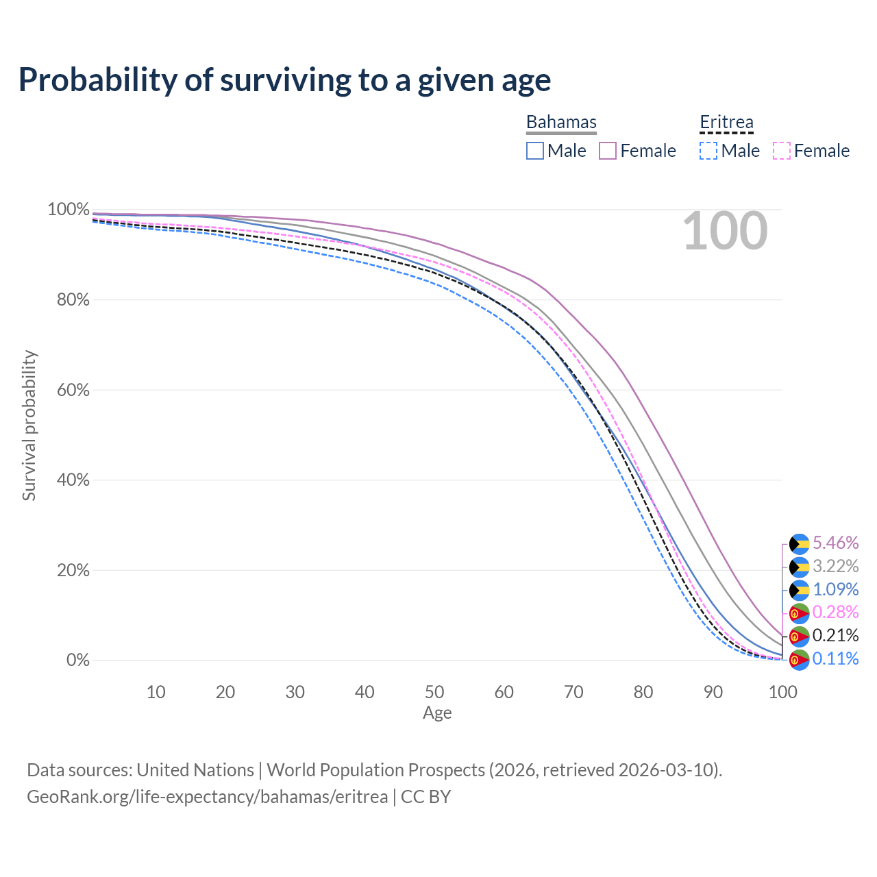 This life expectancy calculator shows the odds of living to 100, 95, 90, and below based on current age for both males and females in the Bahamas and Eritrea, along with mean and median age of death. The calculations are based on the 2026 life tables (actuarial tables) from the UN World Population Prospects.