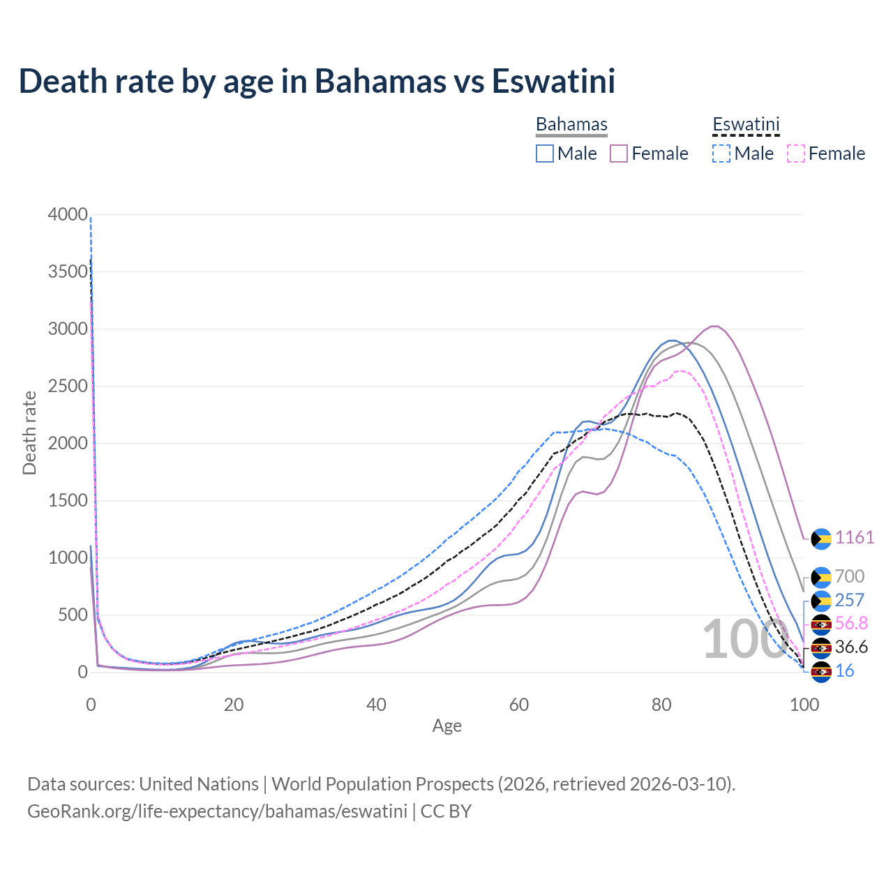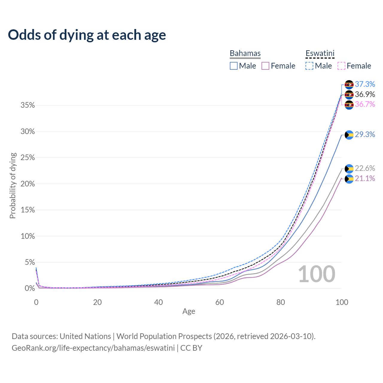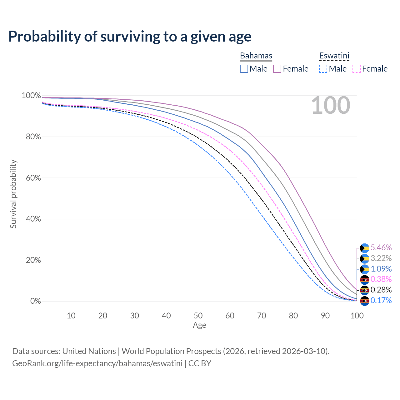 This life expectancy calculator shows the odds of living to 100, 95, 90, and below based on current age for both males and females in the Bahamas and Eswatini, along with mean and median age of death. The calculations are based on the 2026 life tables (actuarial tables) from the UN World Population Prospects.