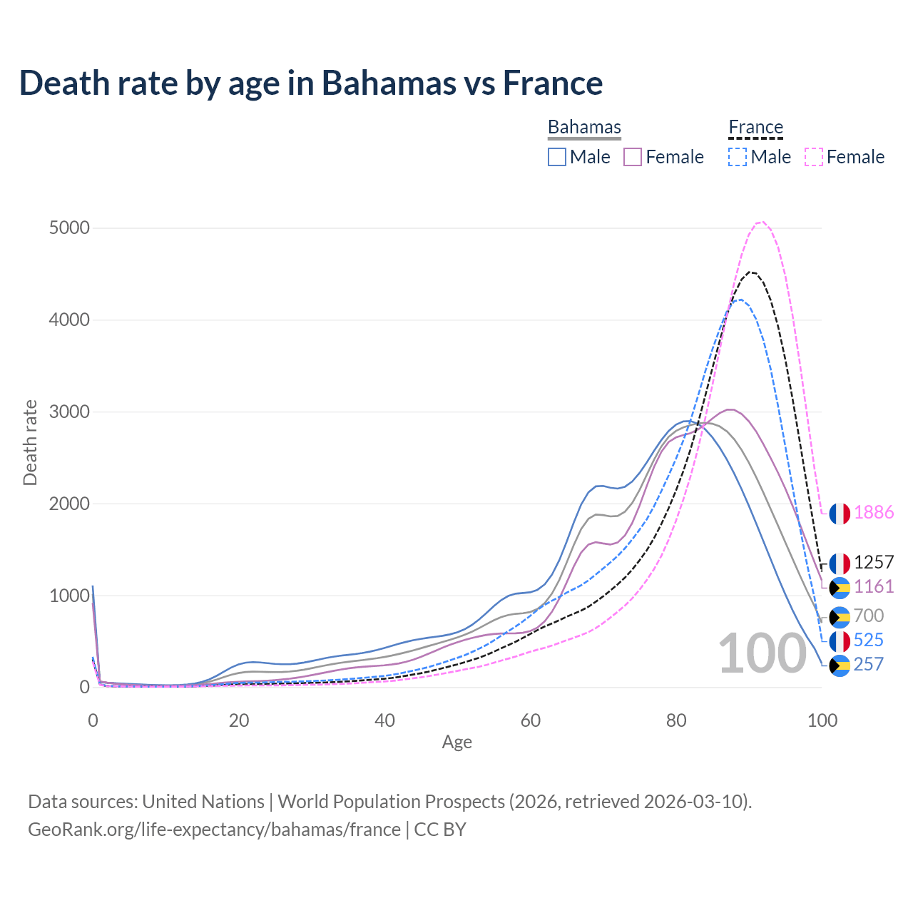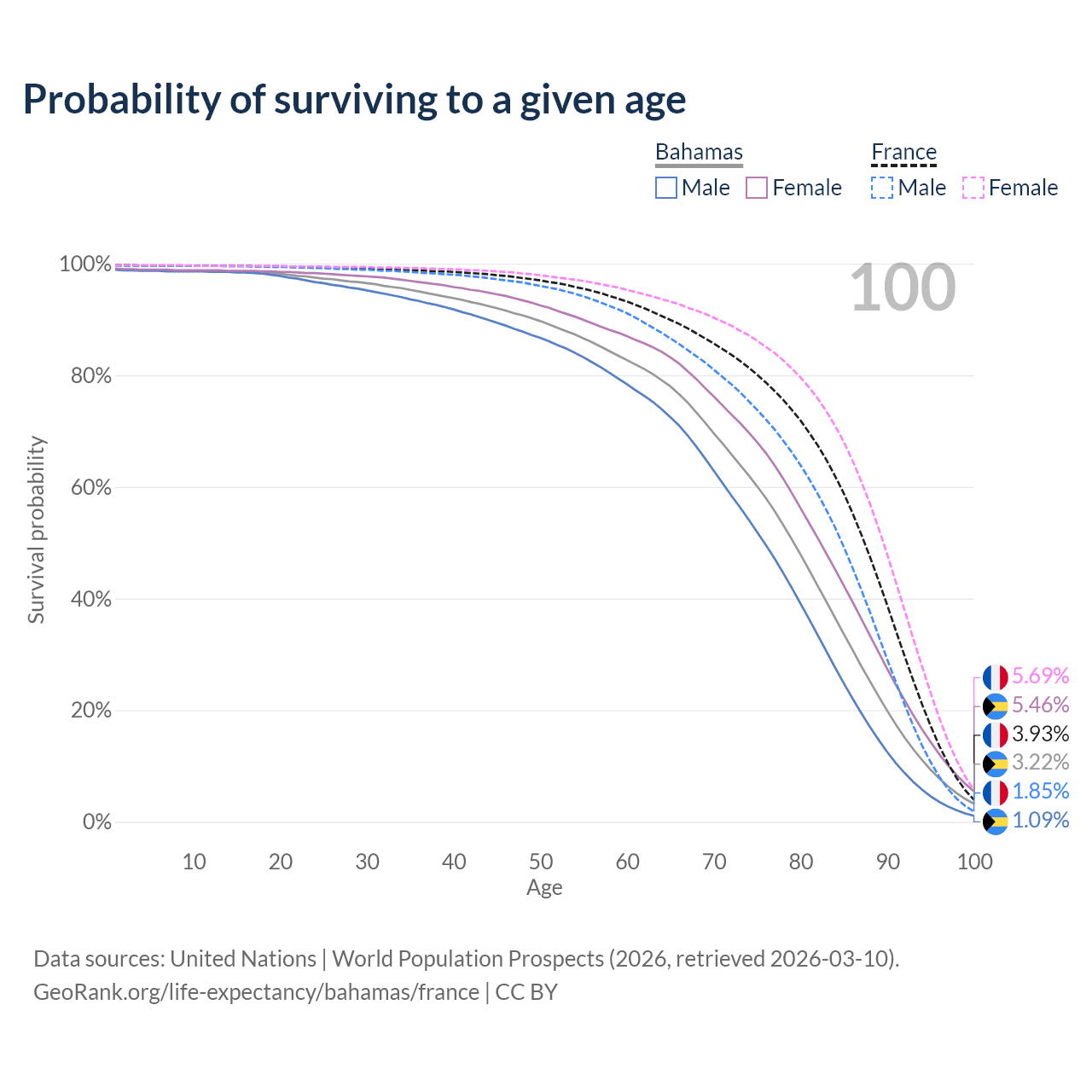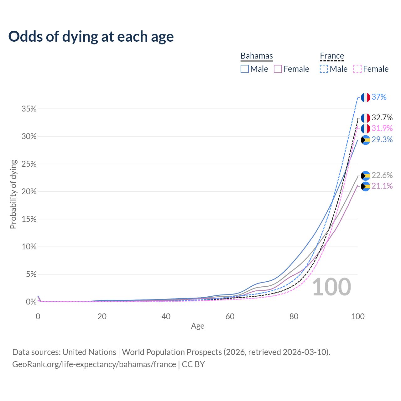 This life expectancy calculator shows the odds of living to 100, 95, 90, and below based on current age for both males and females in the Bahamas and France, along with mean and median age of death. The calculations are based on the 2026 life tables (actuarial tables) from the UN World Population Prospects.