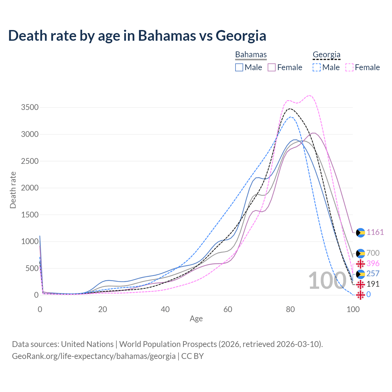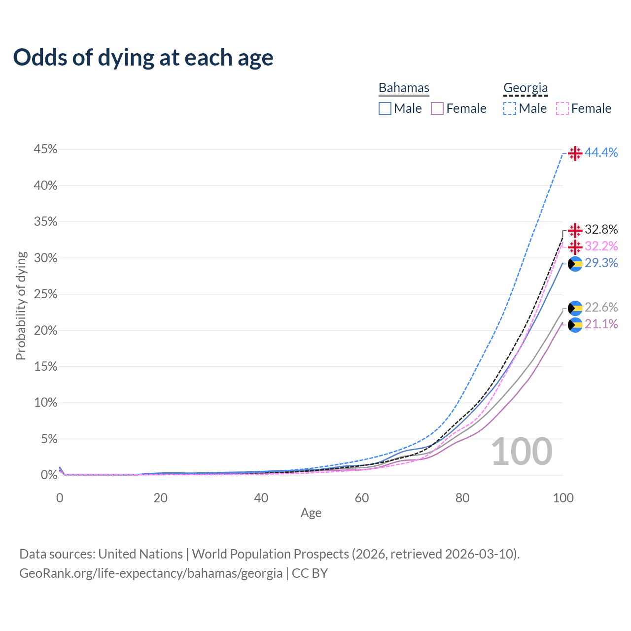 This life expectancy calculator shows the odds of living to 100, 95, 90, and below based on current age for both males and females in the Bahamas and Georgia, along with mean and median age of death. The calculations are based on the 2026 life tables (actuarial tables) from the UN World Population Prospects.