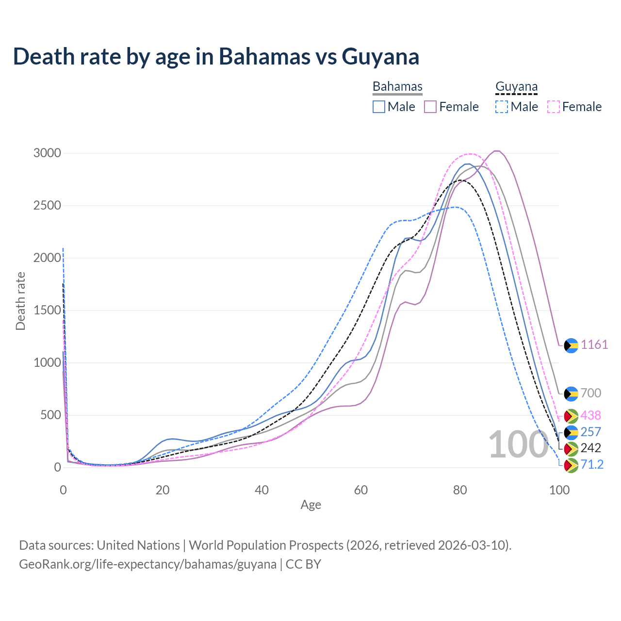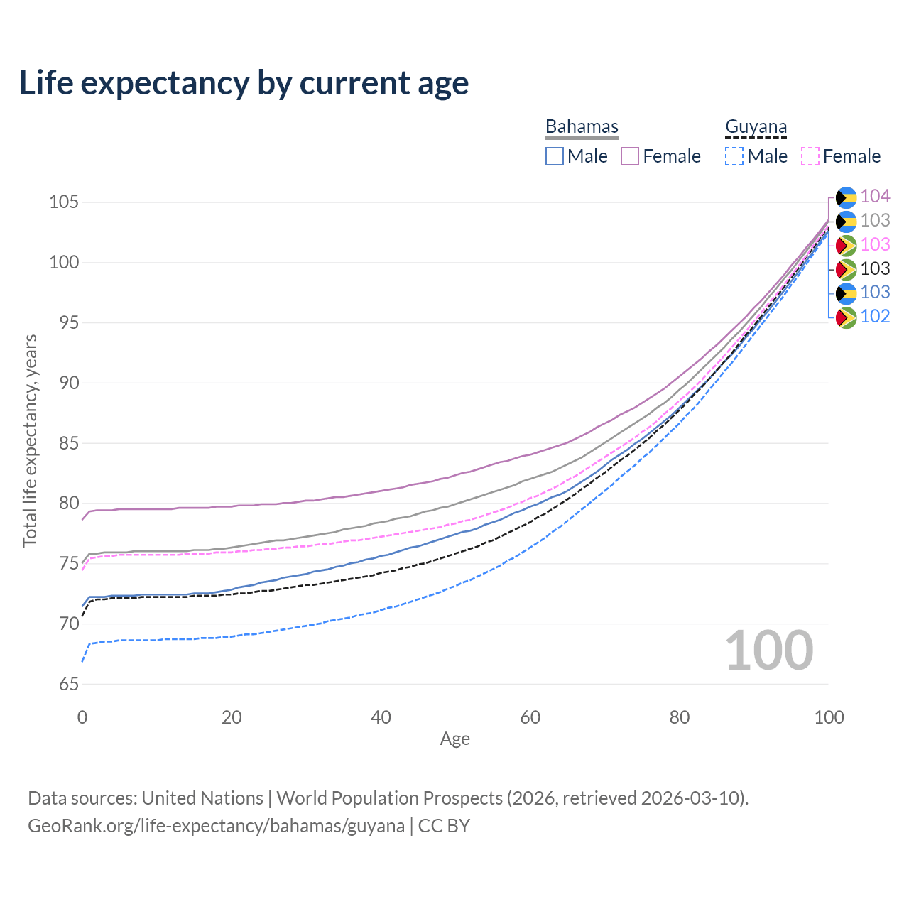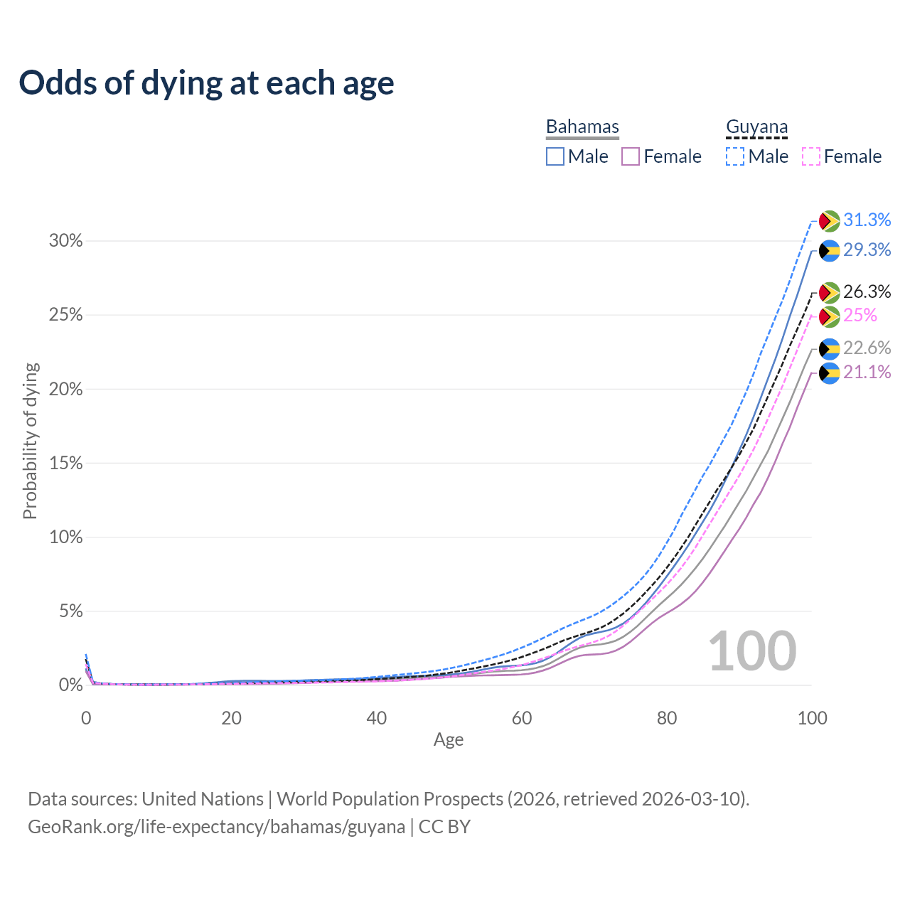 This life expectancy calculator shows the odds of living to 100, 95, 90, and below based on current age for both males and females in the Bahamas and Guyana, along with mean and median age of death. The calculations are based on the 2026 life tables (actuarial tables) from the UN World Population Prospects.