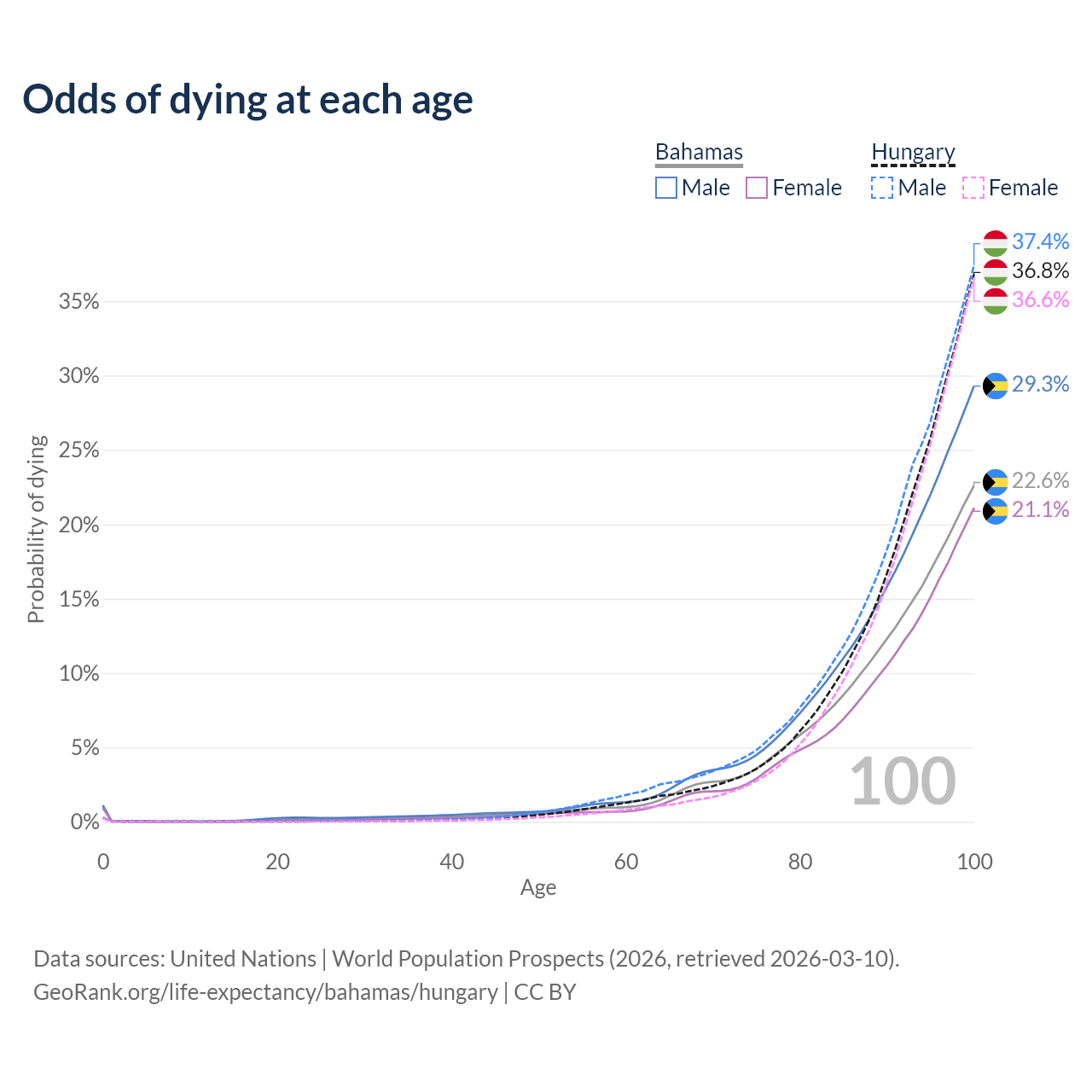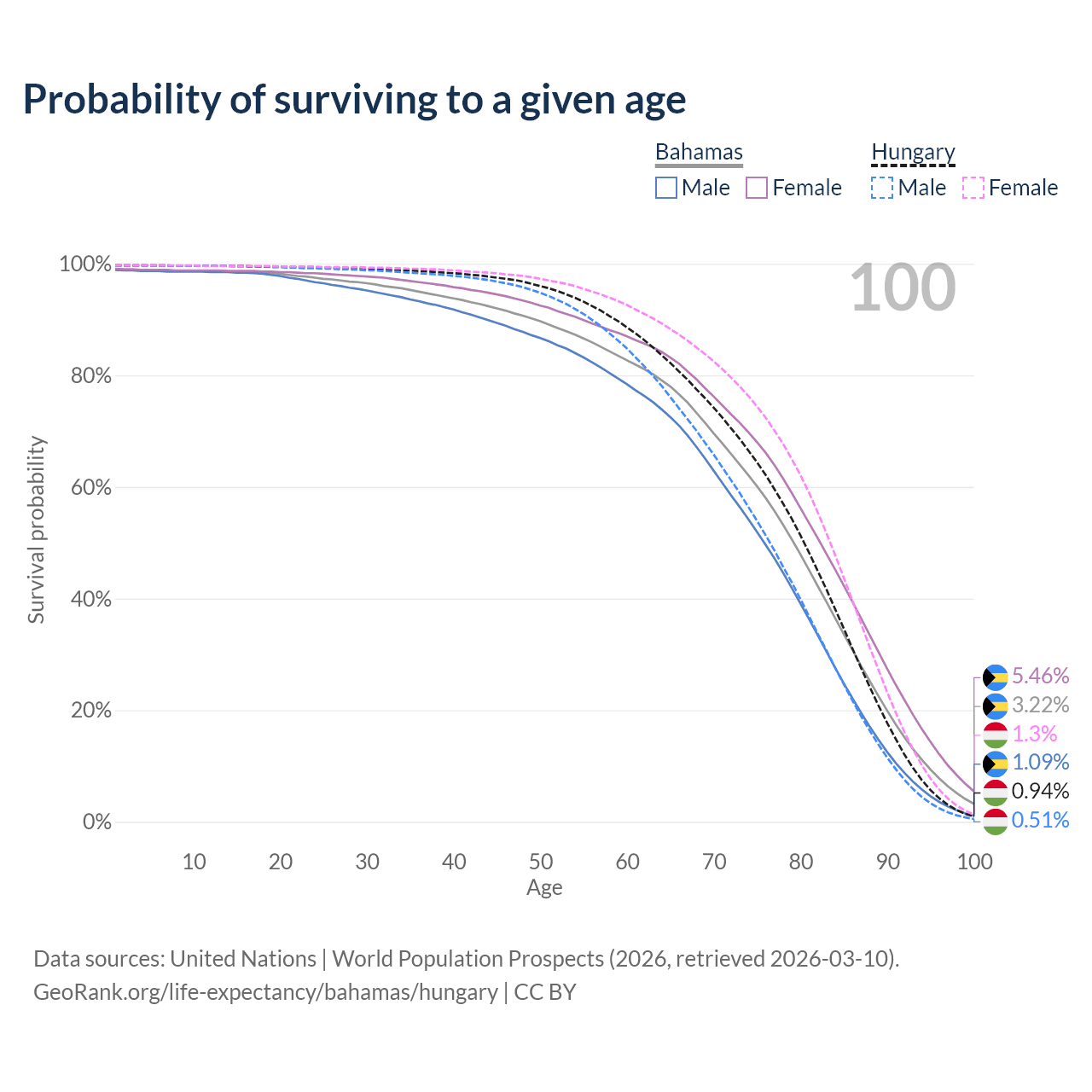 This life expectancy calculator shows the odds of living to 100, 95, 90, and below based on current age for both males and females in the Bahamas and Hungary, along with mean and median age of death. The calculations are based on the 2026 life tables (actuarial tables) from the UN World Population Prospects.