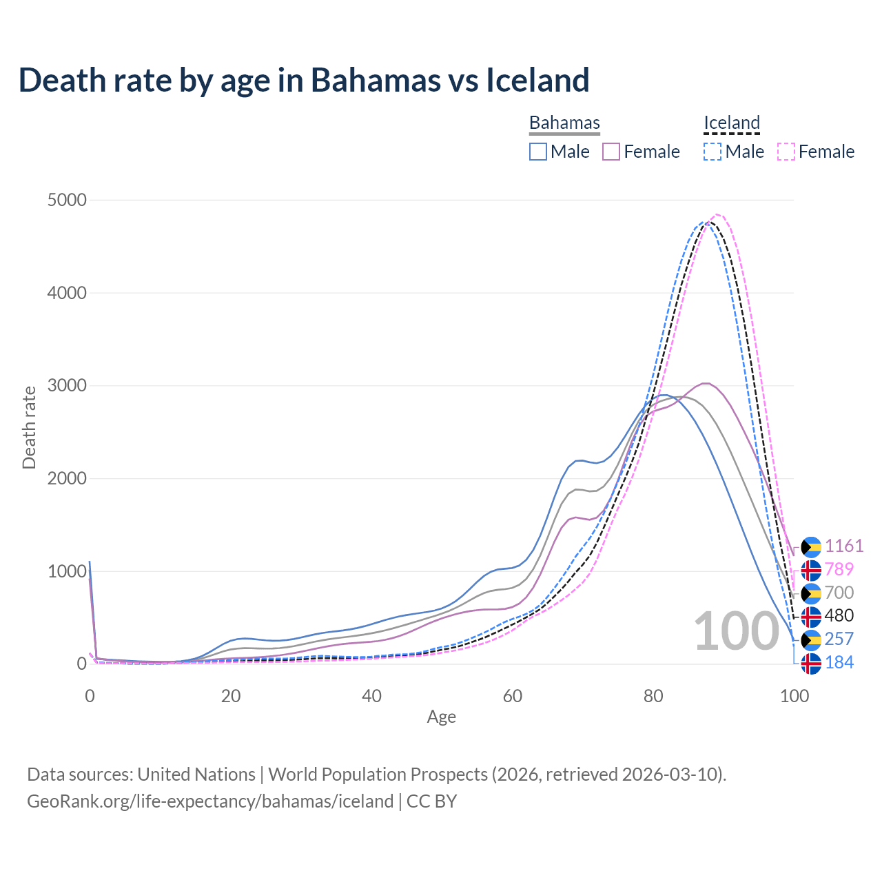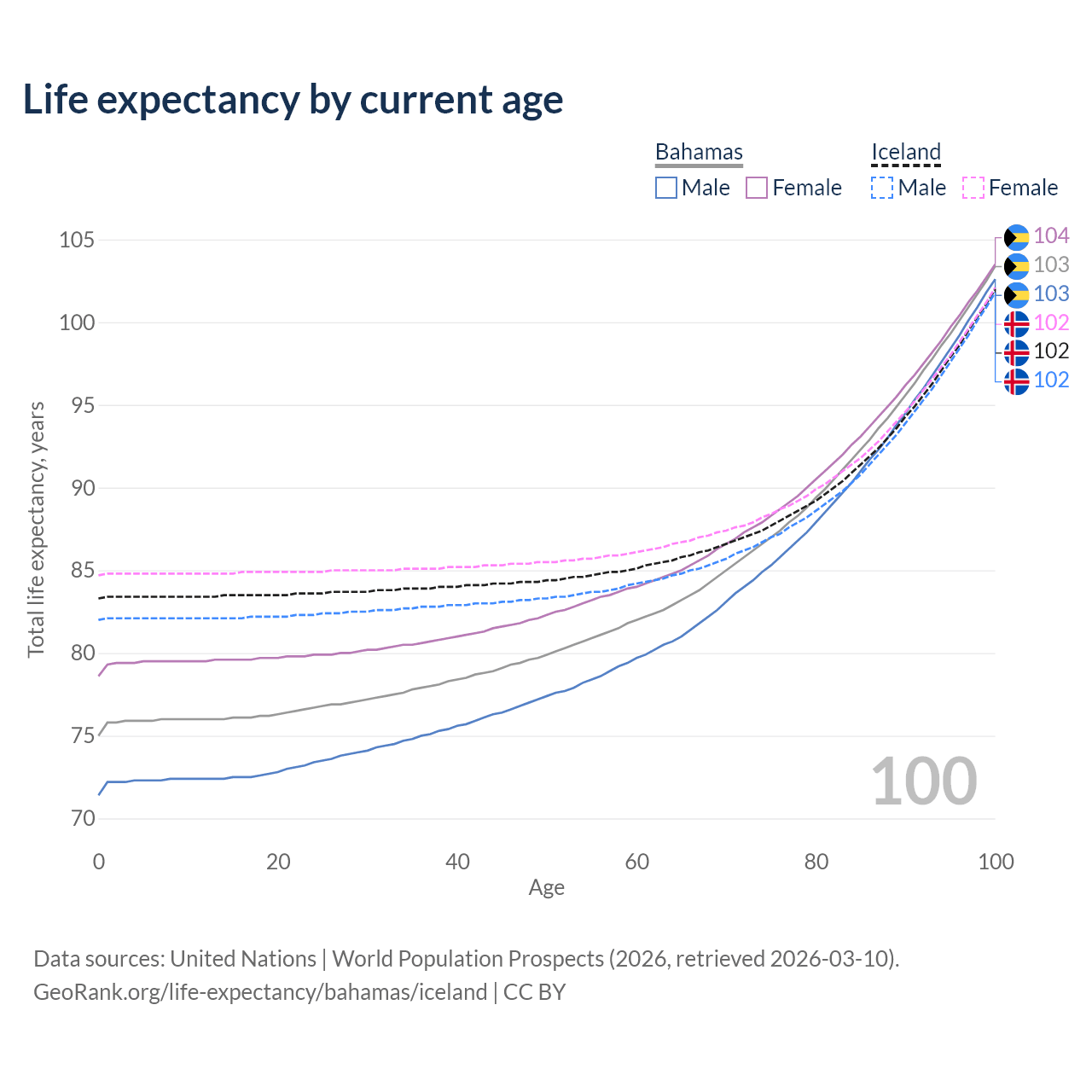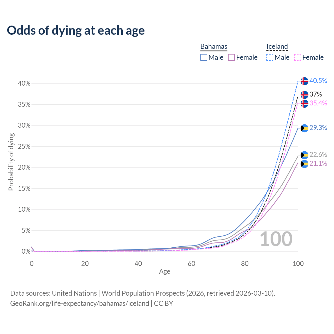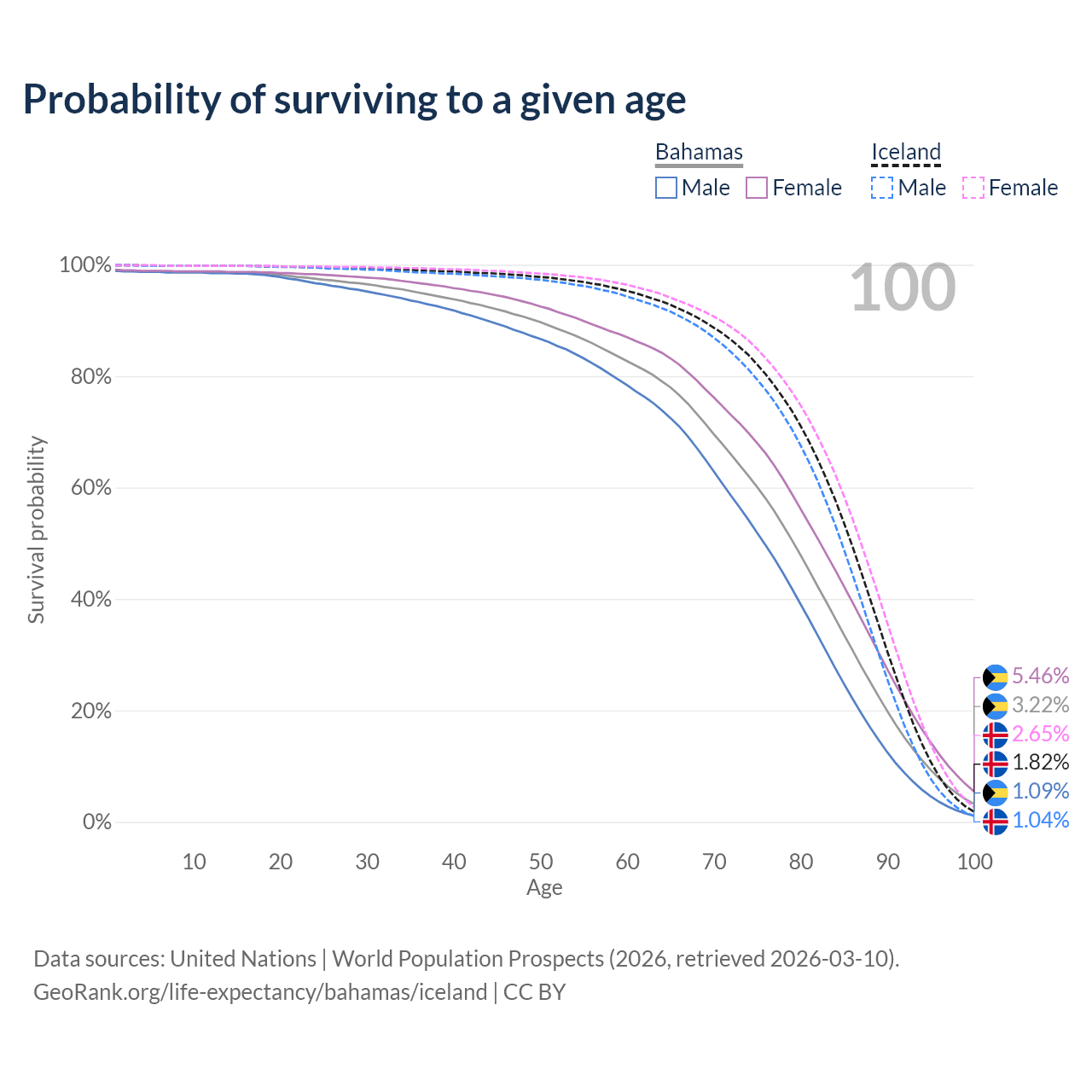 This life expectancy calculator shows the odds of living to 100, 95, 90, and below based on current age for both males and females in the Bahamas and Iceland, along with mean and median age of death. The calculations are based on the 2026 life tables (actuarial tables) from the UN World Population Prospects.